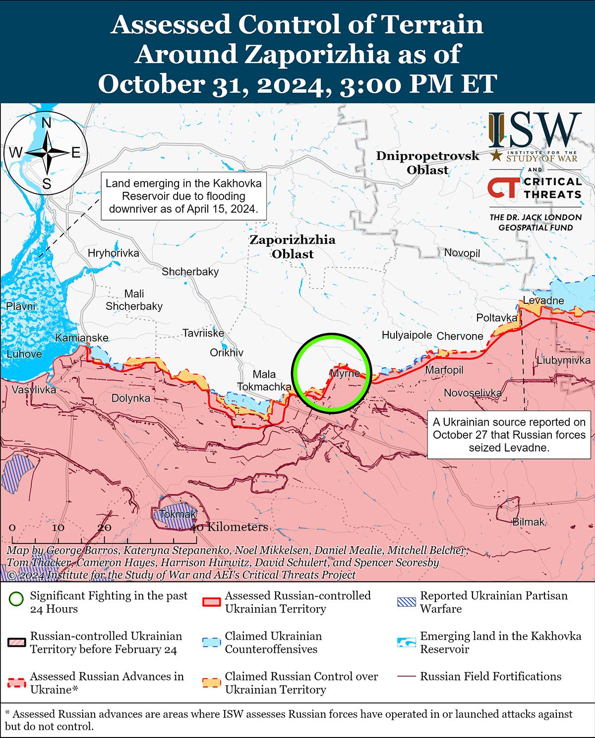 30 и 31 октября российские войска продолжили штурмовые действия на западе Запорожской области, но не добились подтвержденных успехов. Враг продолжил атаки к северо-востоку от Работино в районе Чаривного и к северу от Работино в районе Новоданиловки. [59] Сообщается, что операторы беспилотников 38-й мотострелковой бригады (35-я общевойсковая армия, Восточный военный округ) действуют в направлении Пологи (к востоку от Работино). [60] Сообщается, что на Запорожском направлении действуют артиллерийский дивизион 4-й российской военной базы (58-я общевойсковая армия, Южный военный округ) и подразделения 7-й десантно-штурмовой дивизии ВДВ. [61]