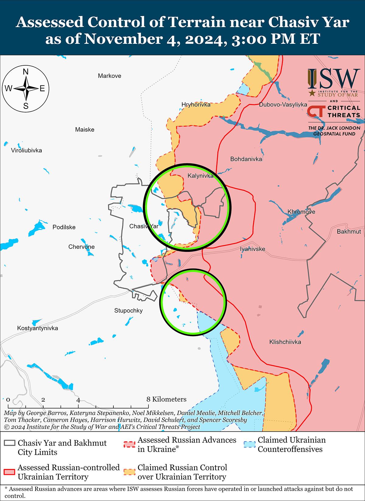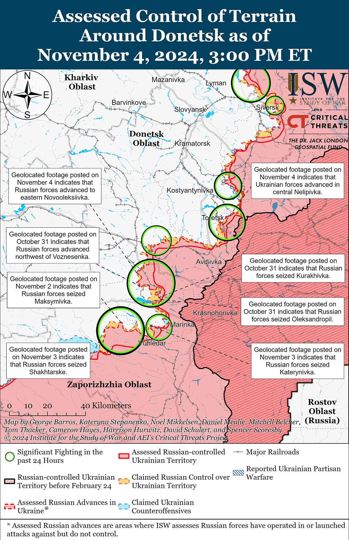 Российские и украинские войска недавно продвинулись под Торецком. На геолоцированных кадрах, опубликованных 3 ноября, видно, что российские войска продвинулись вдоль улицы Молодежной на северо-западе Северного (к востоку от Торецка). [36] Дополнительные геолоцированные кадры, опубликованные 4 ноября, указывают на то, что украинские войска вернули утраченные позиции в центральной части Нелиповки (к юго-западу от Торецка). [37] Генеральный штаб Украины сообщил, что российские войска провели безуспешные наземные атаки в районе самого Торецка; северо-восточнее Торецка в районе Дачного; и западнее Торецка в районе Щербиновки 3 и 4 ноября. [38]