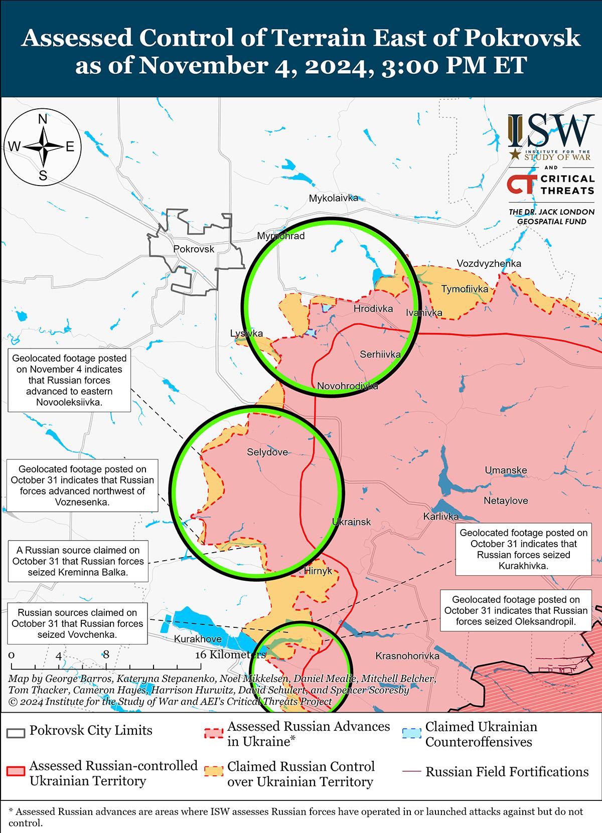В последнее время российские войска продвинулись к югу и юго-востоку от Покровска на фоне продолжающихся наступательных действий в этом районе 4 ноября. Геолоцированные кадры, опубликованные 3 ноября, указывают на то, что российские войска продвинулись в полях к северо-западу от Селидово (к юго-востоку от Покровска). [39] На геолоцированных кадрах, опубликованных 4 ноября, видно, как российские войска ведут механизированное наступление силой примерно до взвода и продвигаются к восточным окраинам Новоалексеевки (к юго-западу от Селидово и к югу от Покровска). [40] Российские источники утверждали, что штурм Новоалексеевки вели подразделения 80-го танкового полка (90-я гвардейская танковая дивизия, 41-я ОА Центрального военного округа). [41] Российский военный блогер утверждал, что российские войска продвинулись в полях к юго-западу от Вишневого (непосредственно к западу от Селидово), хотя в ISW нет визуального подтверждения этого заявления. [42] Российские и украинские источники сообщали о продолжающихся боях к востоку от Покровска в районе Миролюбовки и Проминя; к юго-востоку от Покровска в районах Сухого Яра, Лысовки, Новогродовки, Григорьевки и Вишневого; и южнее Покровска в направлении Новоалексеевки и Юрьевки 3 и 4 ноября. [43]