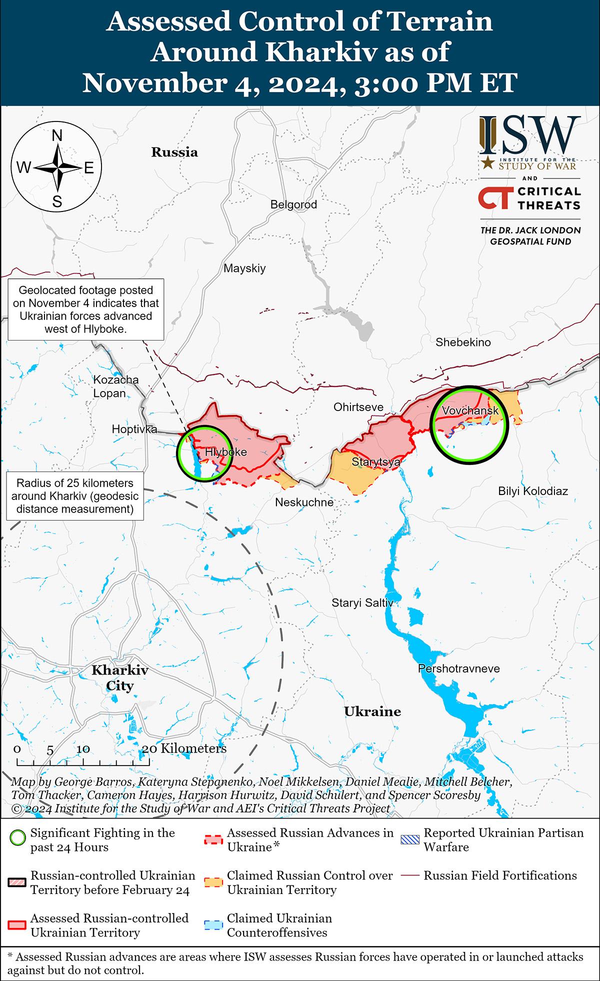 Российские войска недавно незначительно продвинулись к западу от основного украинского выступа в Курской области, хотя украинские и российские источники не сообщали о боях в Глушковском районе 3 и 4 ноября. На геолоцированных кадрах, опубликованных 4 ноября, видно, как украинские войска наносят удары по российским войскам к западу от Нового Пути (к юго-западу от Глушково), что указывает на продвижение российских войск в этом районе. [26]