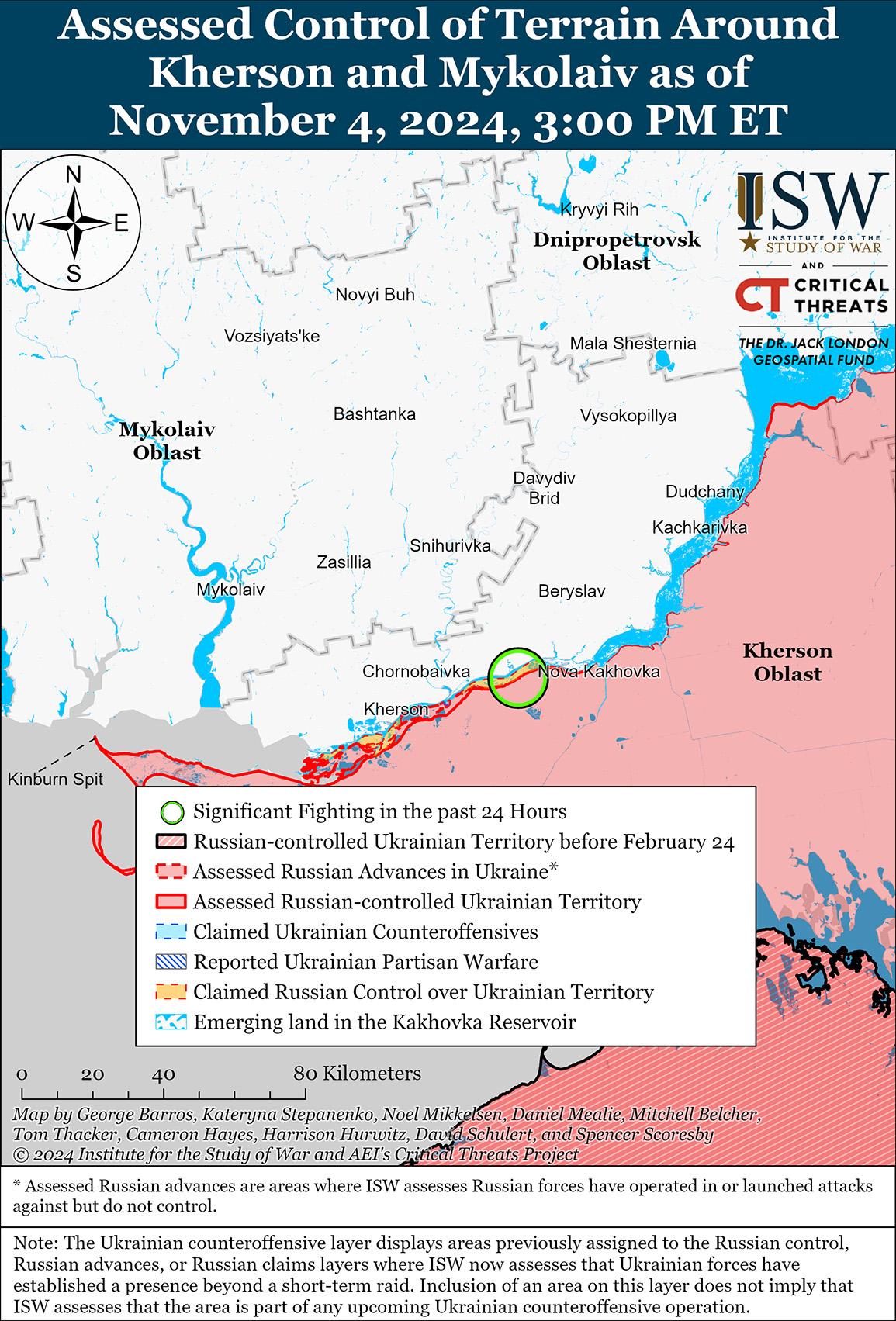 3 и 4 ноября украинские и российские войска продолжали боевые действия на главном украинском выступе в Курской области, однако в последнее время никаких изменений на линии фронта не произошло. Сообщается, что на геолоцированных кадрах, опубликованных 3 ноября, видно, как российские войска наносят удары по украинским позициям в восточной части Мартыновки (к северо-востоку от Суджи), что указывает на то, что украинские войска продолжают действовать в этом районе. [21] Российские источники, в том числе Министерство обороны России, утверждали, что российские войска атаковали к юго-востоку от Коренево в районе Дарьино, Леонидово, Николаево-Дарьино и Новоивановки; и юго-восточнее Суджи в районе Плехово. [22] Российские источники утверждали, что украинские войска атаковали в районе Новоивановки, Леонидово и Плехово, а также к северо-западу от Суджи в районе Погребки. [23] Один из российских военных блогеров объясняет отсутствие изменений на линии фронта ухудшением погодных условий, вероятно связанного с наступлением осеннего сезона грязи. [24] Начальник Украинского центра противодействия дезинформации лейтенант Андрей Коваленко 4 ноября сообщил, что северокорейские военнослужащие «попали под обстрел» в Курской области, но не стал вдаваться в подробности. [25]