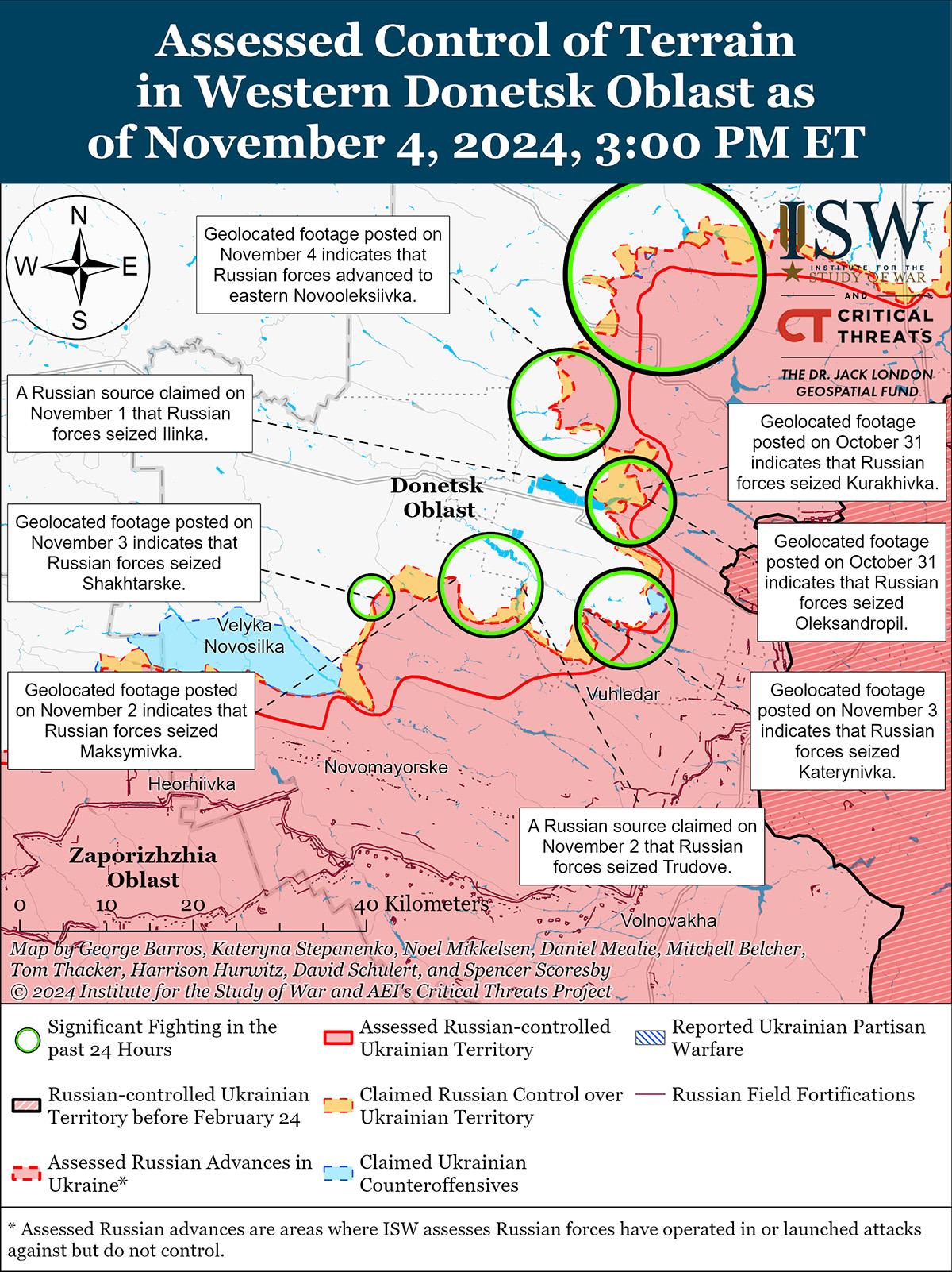 В последнее время российские войска продвинулись к северо-западу от Курахово на фоне продолжающихся наступательных действий на Кураховском направлении 4 ноября. Геолоцированные кадры, опубликованные 4 ноября, указывают на то, что российские войска продвинулись к западной части Новодмитровки (к северо-западу от Курахово). [44] Глава ДНР Денис Пушилин 4 ноября опубликовал кадры, якобы снятые из Горняка (к северо-востоку от Курахово), из которых следует, что российские войска, вероятно, недавно захватили населенный пункт. [45] Российские источники утверждали, что российские войска также продвинулись в полях к югу от Кременной Балки (к юго-востоку от Новодмитровки и к северу от Курахово), возле Ильлинки (к северо-востоку от Курахово), а также возле Новоселидовки и Вознесенки (оба к северу от Курахово), хотя ISW пока не зафиксировал подтверждения этих заявлений. [46] Спикер пресс-службы украинской бригады, действующей на Кураховском направлении, сообщил, что российские войска пытаются эвакуировать и отремонтировать механизированную технику, чтобы подготовиться к дальнейшим механизированным атакам на Кураховском направлении, но отметил, что только в октябре 2024 года украинские войска уничтожили в этом районе почти 100 единиц бронетехники, включая танки и другую технику. [47] По данным Генштаба Украины, российские войска продолжали наземные атаки к северо-западу от Курахово в районе Новодмитровки; севернее Курахово в районе Кременной Балки и Новоселидовки; и северо-восточнее Курахово в районе Ильинки, Волченко и Островского 3 и 4 ноября. [48]
