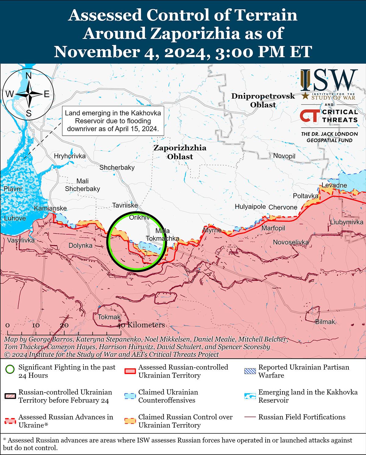 4 ноября враг продолжил наступательные действия на западе Запорожской области, но не продвинулся вперед. В Генштабе Украины сообщили, что российские войска продолжают атаки к северу от Работино вблизи Новоданиловки и Орехова; и к северо-западу от Работино в районе Новоандреевки и Степного. [53]