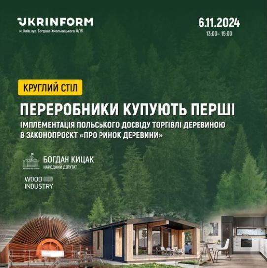 6 листопада, 13:00 у Прес-центрі «Укрінформ» відбудеться круглий стіл на тему: «Переробники – перші. Імплементація польського досвіду торгівлі деревиною в законопроєкт «Про ринок деревини»