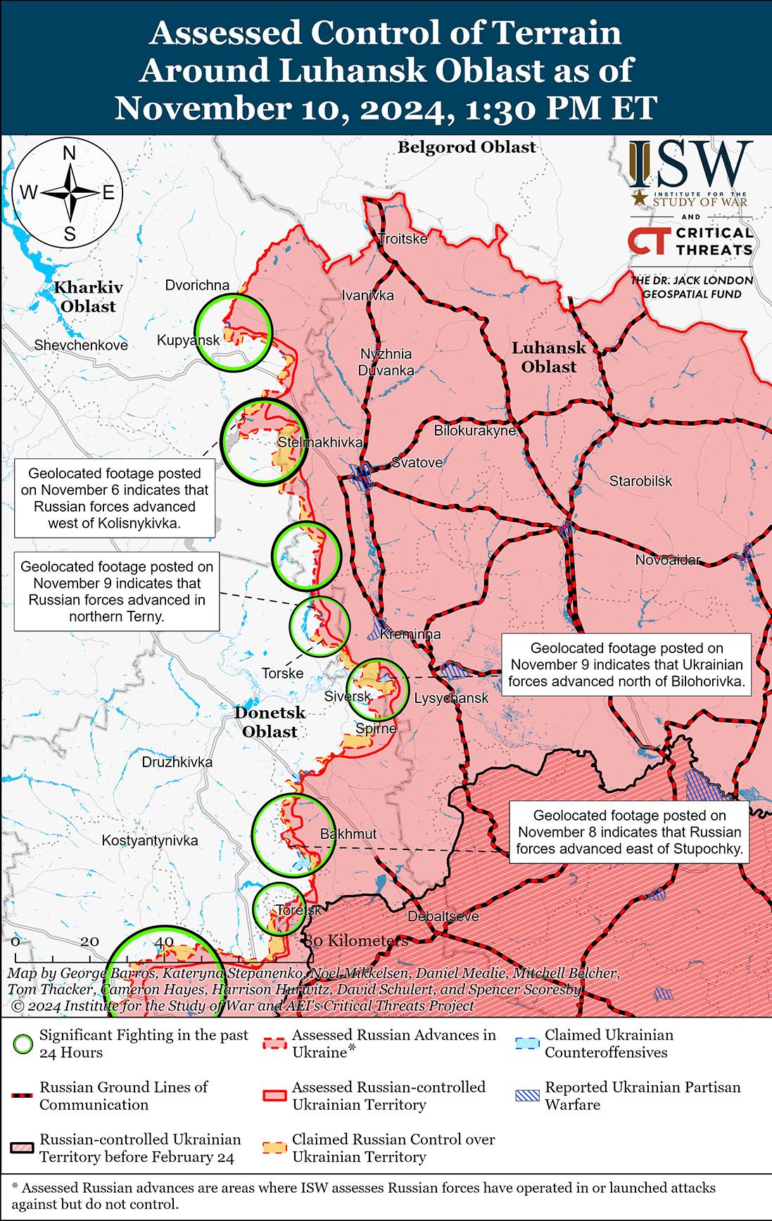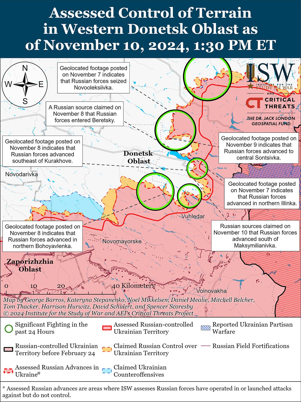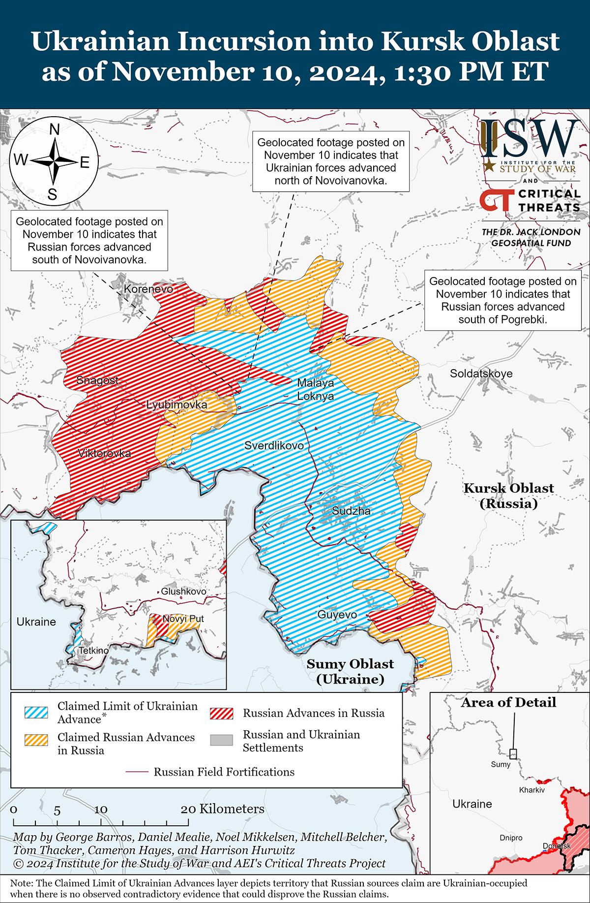 Российские и украинские войска недавно продвинулись на главном украинском выступе в Курской области на фоне продолжающихся боев 10 ноября. Геолоцированные кадры, опубликованные 10 ноября, указывают на то, что украинские войска недавно продвинулись к северу от Новоивановки (к юго-востоку от Коренево), а российские войска недавно продвинулись к югу от населенного пункта. [8] Дополнительные геолоцированные кадры, опубликованные 10 ноября, указывают на то, что в последнее время российские войска продвинулись к югу и востоку от Погребок (к северу от Суджи). [9] Министерство обороны России заявило 10 ноября, что украинские войска контратаковали к юго-востоку от Коренево в районе Новоивановки, Дарьино и Зеленого Шляха и к востоку от Коренево в районе Новой Сорочины. [10] Представитель украинской бригады, действующей в Курской области, заявил 10 ноября, что российские войска активизировали наступательные операции с использованием бронетранспортеров, боевых машин пехоты и танков в Курской области. [11] Сообщается, что подразделения 810-й бригады морской пехоты России (Черноморский флот [ЧФ], Южный военный округ [ЮВО]) действуют под Погребками. [12]