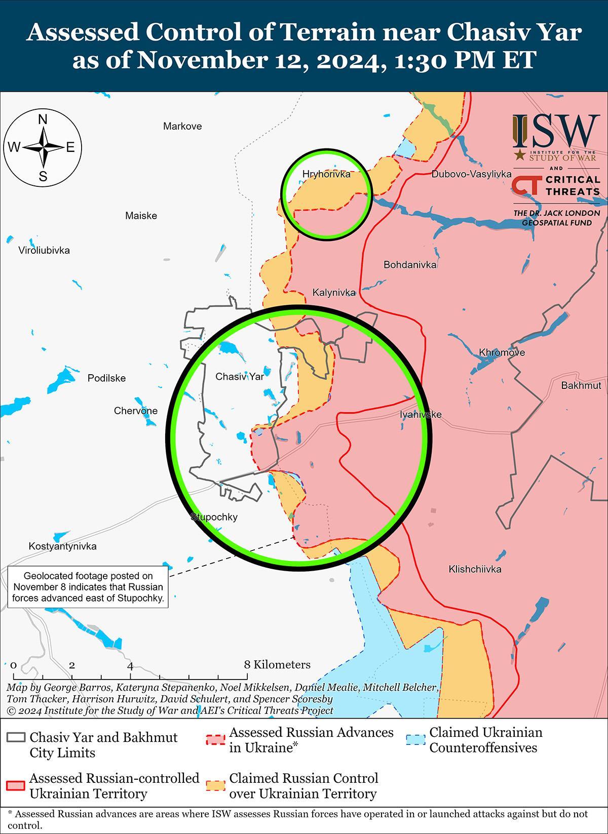 12 ноября враг продолжил наступательные действия на направлении Часова Яра, но подтвержденных успехов не достиг. Российский военный блогер повторил утверждения о том, что российские войска продвигаются в Ступочках (к югу от Часова Яра), но ISW до сих пор обнаружил только геолокационные доказательства, позволяющие ISW оценить, что российские войска находятся примерно в 2,5 километрах от населенного пункта. [54] 11 и 12 ноября российские войска наступали в районе Часова Яра. [55] Сообщается, что операторы беспилотников российского отряда «Буревестник» (Добровольческий корпус России) и отряда спецназа «Охотник» (51-я общевойсковая армия, бывший 1-й армейский корпус Донецкой Народной Республики [ДНР]) продолжают действовать в районе Часова Яра. [56]