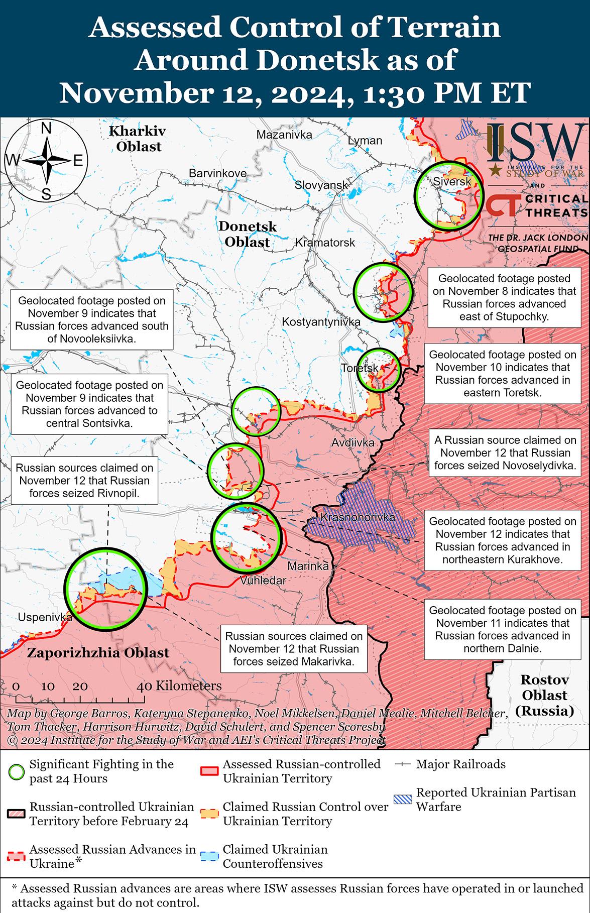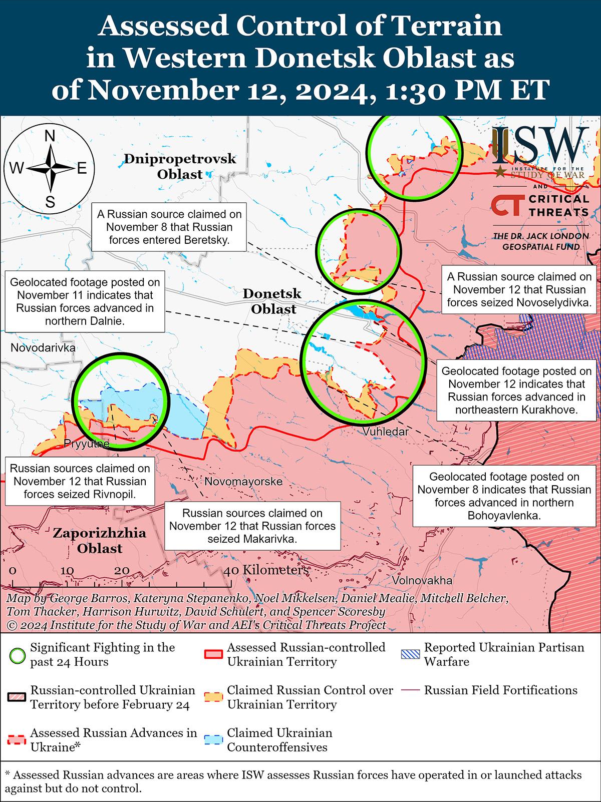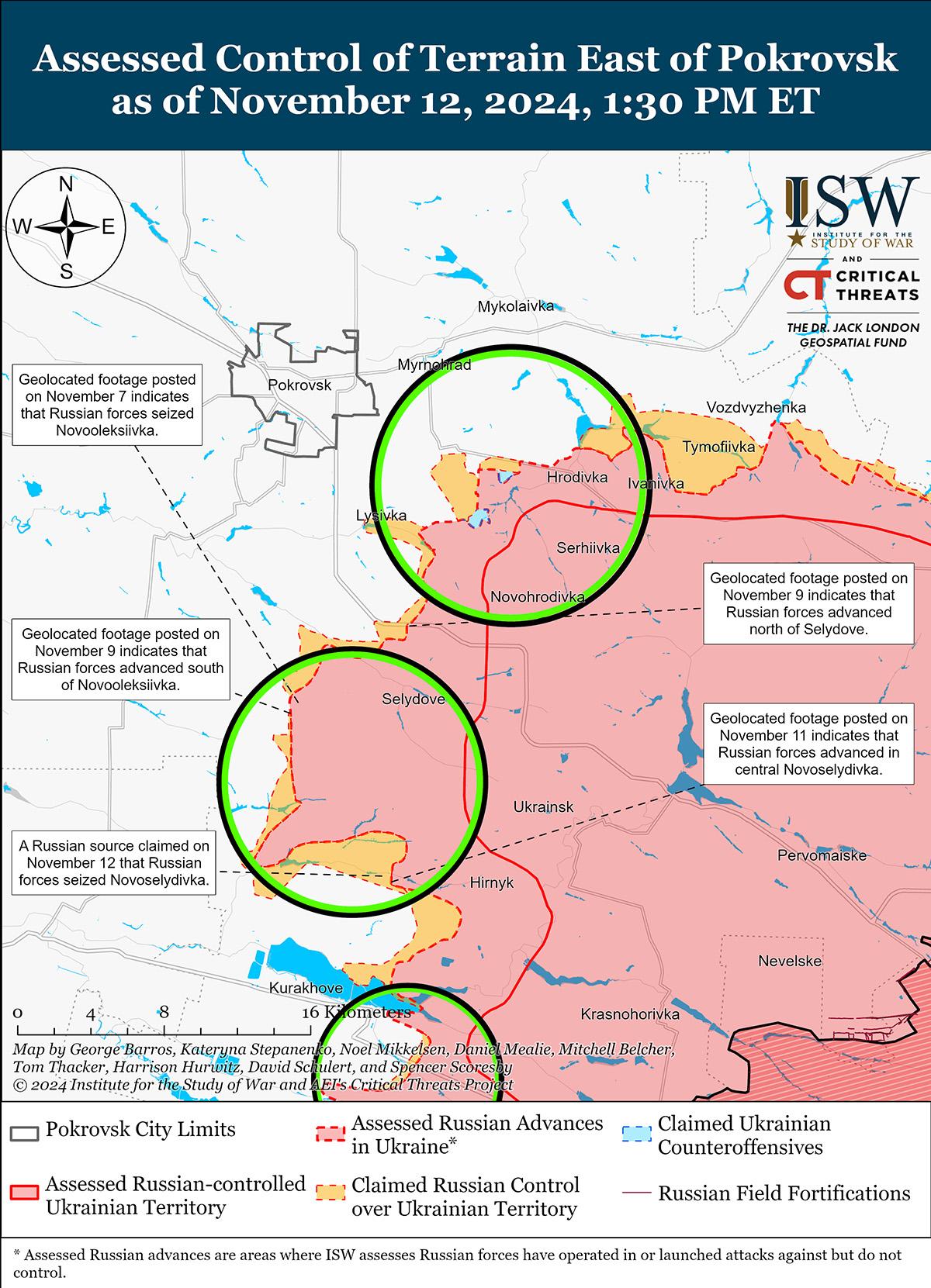 Сообщается, что 12 ноября российские войска продвинулись на Покровском направлении, но подтвержденных изменений на линии фронта не было. Российские военные блогеры утверждали, что российские войска продвинулись в южной части Петровки (к юго-востоку от Покровска и к северо-западу от Селидово), к северо-востоку от Юрьевки (к западу от Селидово) и в трех километрах к югу от Новоалексеевки (к юго-западу от Селидово). [61] Однако ISW не обнаружил подтверждения этих заявлений. Враг вел наступательные действия к востоку от Покровска в районе Проминя и Миролюбовки; к юго-востоку от Покровска в районе Лысовки, Селидово, Григорьевки, Крутого Яра и Пустынки; и южнее Покровска в районе Петровки и Новоалексеевки и в направлении Украинки 11 и 12 ноября. [62] Российский источник утверждал, что украинские войска безуспешно контратаковали между Сухим Яром и Крутым Яром (оба к юго-востоку от Покровска). [63] Представитель украинской бригады, действующей на Покровском направлении, сообщил 11 ноября, что удары украинской артиллерии и беспилотников приводят к тому, что российские войска используют меньше техники во время атак, а российская пехота в основном передвигается в пешем порядке небольшими группами. [64]