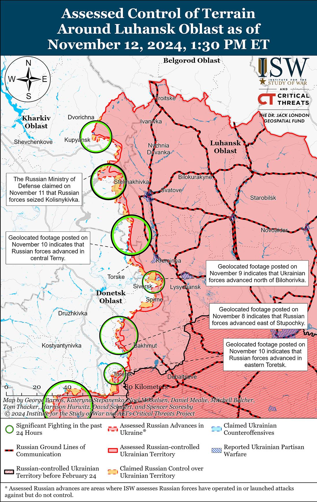 12 ноября враг продолжил наступательные действия на линии Купянск – Сватово – Кременная, но подтвержденных успехов не достиг. 12 ноября российские источники заявили, что российские войска заняли позиции на окраинах Терны (к северо-западу от Кременной) и продвинулись в центр Терны, но ISW не обнаружил визуального подтверждения этих заявлений. [48] Представитель украинской бригады, действующей на Лиманском направлении, заявил, что российские войска используют военную технику экономно, как правило, раз в две недели, и в основном ведут пехотные атаки на этом направлении. [49] Сообщается, что российские войска продолжали атаки к северо-западу от Купянска в районе Кондрашовки; к юго-востоку от Купянска в районе Колесниковки, Крутяковки, Загрызово и в направлении Лозовой; к юго-западу от Сватово в районе Грековки и Новомихайловки; к западу от Сватово в направлении Новоплатоновки; северо-западнее Кременной в районе Невского и Тернов; к западу от Кременной у Торского; и юго-западнее Кременной в районе Серебрянки 11 и 12 ноября. [50] Сообщается, что в Тернах действуют подразделения российской 144-й мотострелковой дивизии (20-я общевойсковая армия, Московский военный округ). [51]