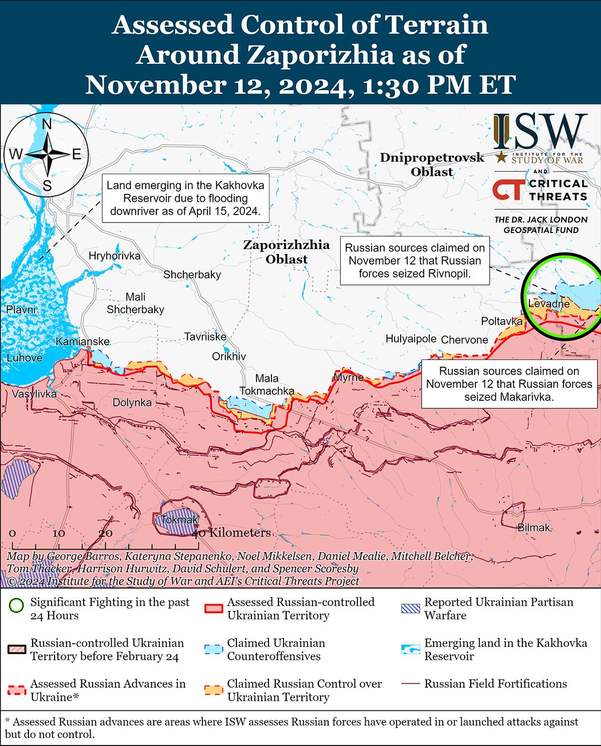 11 и 12 ноября враг продолжил наступательные действия на западе Запорожской области к северу от Работино в районе Новоандреевки. [73] 11 и 12 ноября оккупационный чиновник Запорожской области Владимир Рогов заявил, что украинские войска готовятся нанести удар по плотине в Васильевке (к западу от Работино и к югу от Запорожья), чтобы замедлить потенциальное продвижение россиян к Запорожью. [74] ISW не наблюдал других источников, делающих подобные заявления.