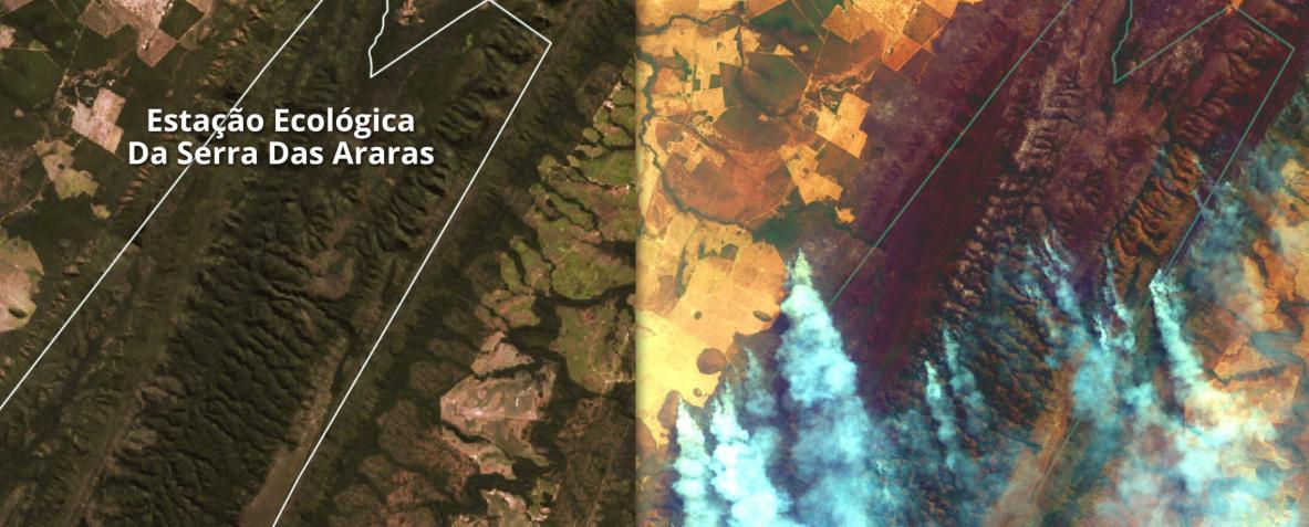 Баннерное изображение: Спутниковые снимки Landsat с EarthExplorer и Sentinel-2 с Copernicus показывают лесные пожары в заповеднике Серра-дас-Арарас в бразильском Серрадо. Изображение предоставлено Mongabay.