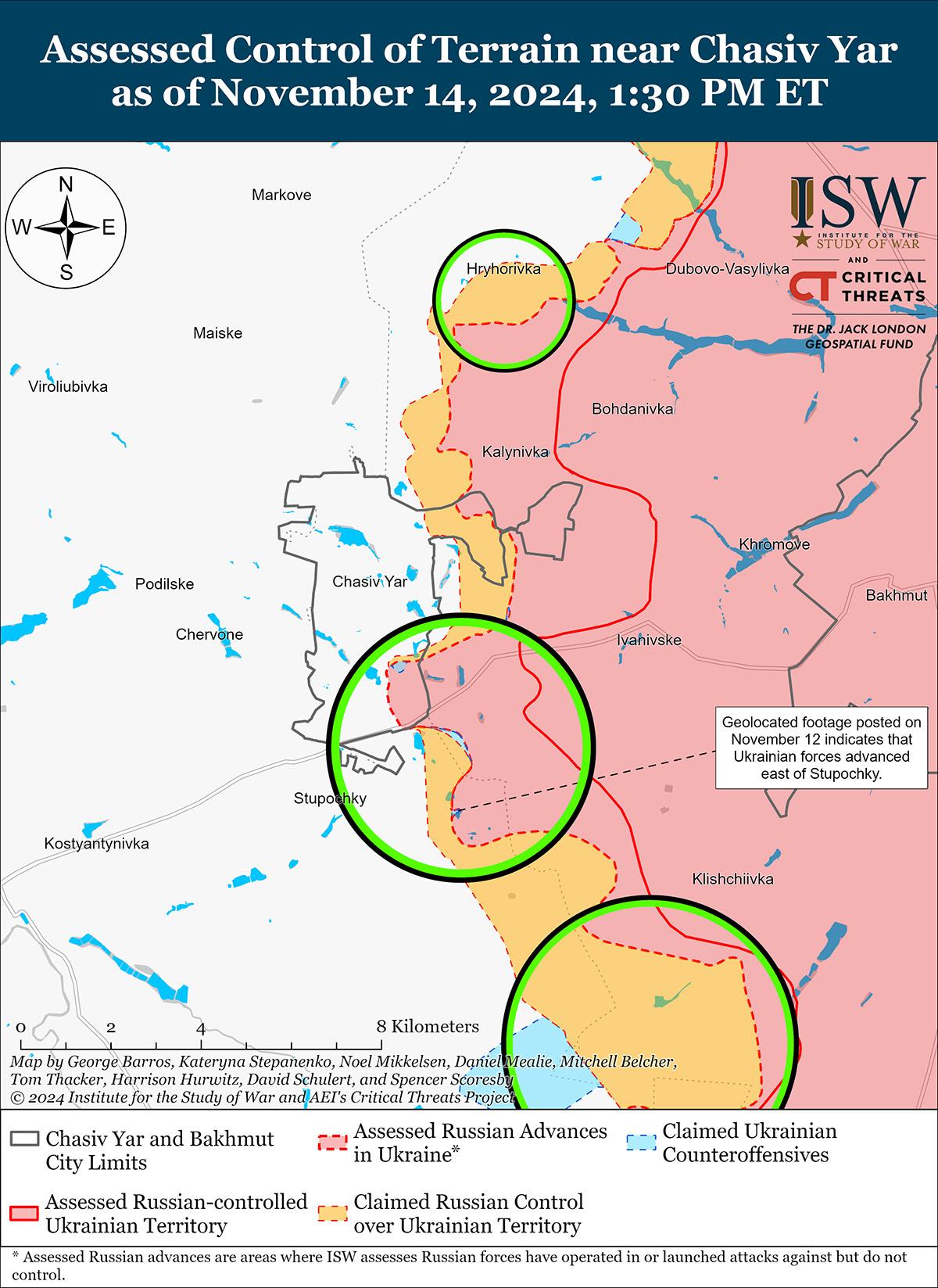 В последнее время российские войска продвинулись к югу от Часова Яра на фоне продолжающихся наступательных действий на этом направлении 14 ноября. Геолоцированные кадры, опубликованные 14 ноября, свидетельствуют о том, что в последнее время российские войска продвинулись к востоку от Белой Горы (к югу от Часова Яра). [47] 14 ноября российский военный блогер заявил, что российские войска продвинулись к юго-востоку от Ступочков (к югу от Часова Яра), но в ISW не обнаружили визуального подтверждения этого заявления. [48] 13 ноября российские войска вели наступательные действия в районе Ступочки. [49] Сообщается, что на направлении Часова Яра действуют части российского Ивановского воздушно-десантного соединения (98-я дивизия ВДВ) и 6-й мотострелковой дивизии (3-й АК). [50]