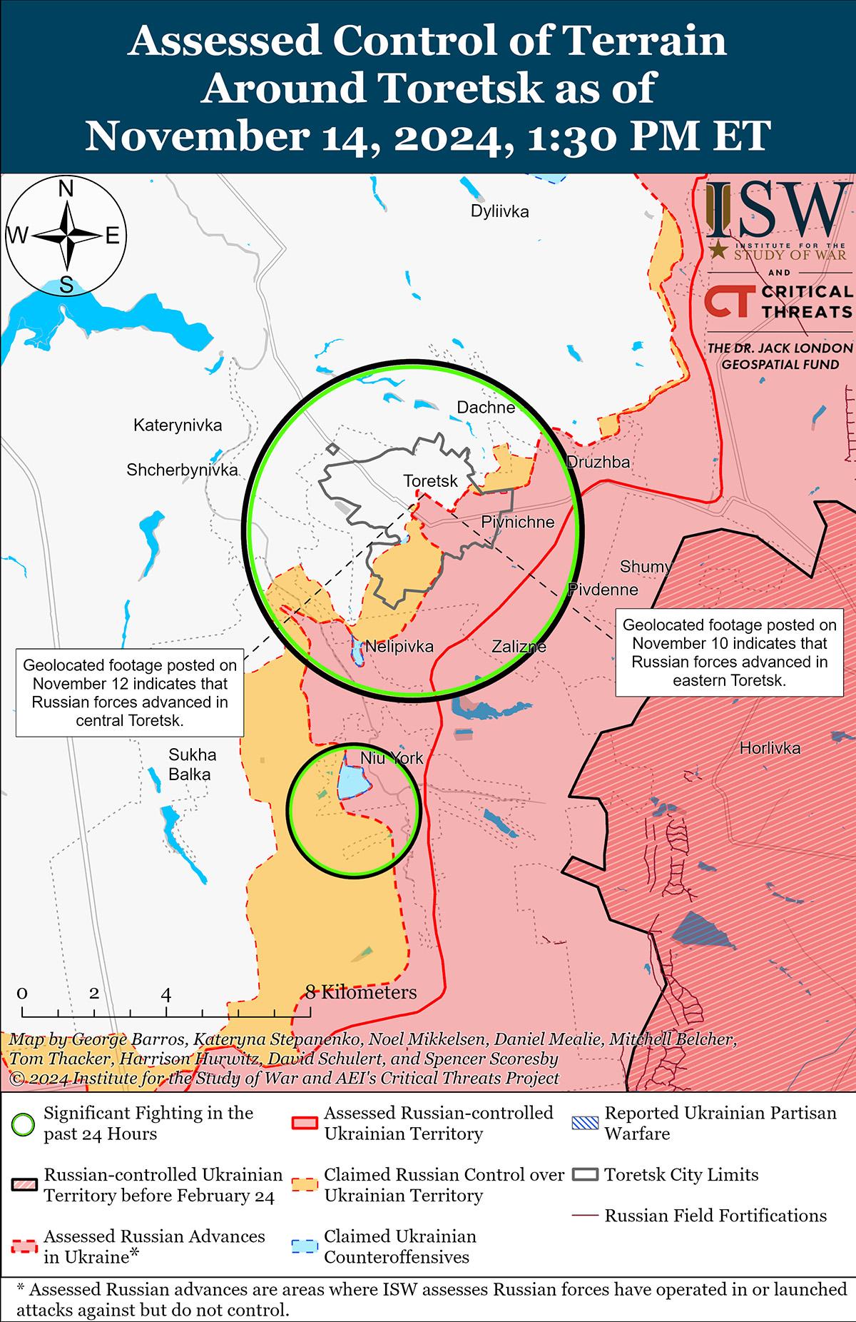 14 ноября враг продолжил наступательные действия на Торецком направлении, но подтвержденных успехов не имел. 13 ноября российский военный блогер заявил, что российские войска продвинулись в южном Крымском (к северо-востоку от Торецка), но ISW не обнаружил визуального подтверждения этого заявления. [51] Российские войска продолжали наступательные действия в районе Торецка; к северу от Торецка в районе Дилиевки; непосредственно к западу от Торецка в районе Щербиновки; и юго-западнее Торецка в районе Нелиповки 13 и 14 ноября. [52]