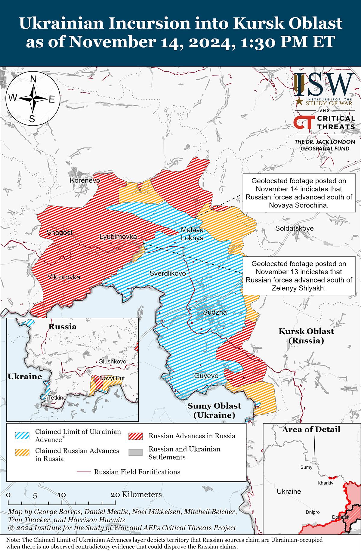 В последнее время российские войска продвинулись в пределах главного украинского выступа в Курской области. На геолоцированных кадрах, опубликованных 13 ноября, видно, как украинские войска отбивают российскую механизированную атаку силой до взвода к югу от Зеленого Шляха (к юго-востоку от Коренево) и указывают на то, что российские войска продвинулись в этом районе. [27] На геолоцированных кадрах, опубликованных 14 ноября, видно, что подразделения 810-й бригады морской пехоты (Черноморский флот, Южный военный округ [ЮВО]) предприняли механизированные атаки в районе Марьевки, Погребок, Орловки и Новой Сорочины (все к северо-западу от Суджи) и продвинулись в южную часть Новой Сорочины. [28] Российские военные блогеры утверждали, что темпы российского наступления замедлились; что российские войска захватили некоторые позиции между Погребками и Кремяным (к востоку от Коренево); и нет подтверждений, что российские войска вошли в Куриловку (к югу от Суджи). [29] Российские источники, в том числе Министерство обороны РФ, утверждали, что бои продолжались к востоку от Коренево в районе Кремяного; южнее Коренево в районе Николаево-Дарьино; юго-восточнее Коренево в районе Новоивановки, Леонидово и Дарьино; северо-западнее Суджи в районе Новой Сорочины и Малой Локни; и южнее Суджи у Плехово. [30] Сообщается, что подразделения российской 155-й бригады морской пехоты (Тихоокеанский флот, Восточный военный округ [ВВО]), 56-го воздушно-десантного полка (7-я дивизия ВДВ) и 106-й дивизии ВДВ продолжали действовать на курском направлении. [31] Сообщается, что штурмовые подразделения российского отдельного батальона спецназа «Арбат» (Добровольческий корпус России) действуют в районе Плехово. [32]