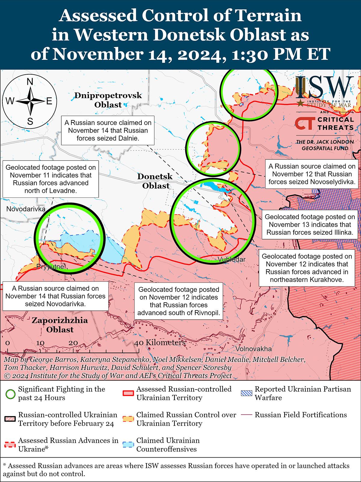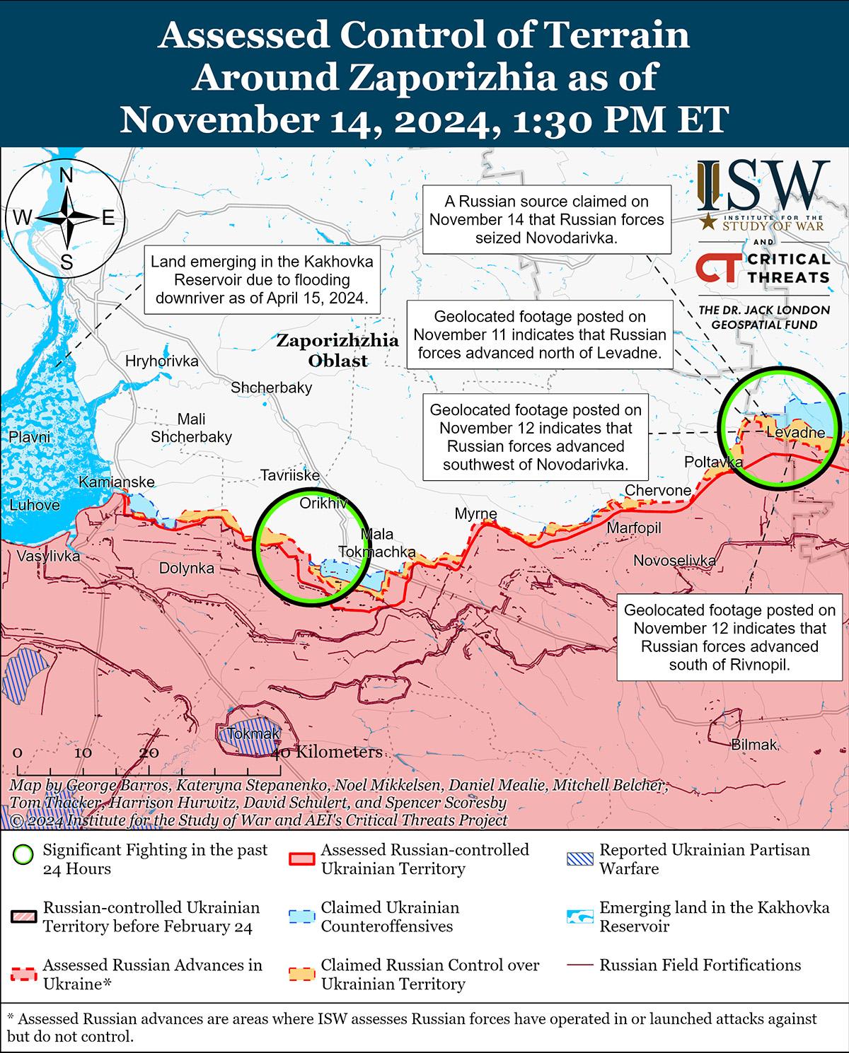 В последнее время российские войска продвинулись в приграничье Донецкой и Запорожской областей на фоне продолжающихся наступательных действий в этом районе 14 ноября. Геолоцированные кадры, опубликованные 11 и 12 ноября, свидетельствуют о том, что российские войска в последнее время продвинулись к югу от Ровнополя и к северу от Левадного (оба к юго-западу от Великой Новоселки). [67] Российский военный блогер утверждал, что российские войска захватили Новодаровку, хотя в ISW не обнаружили визуальных доказательств этого. [68] 13 и 14 ноября враг продолжил атаки к югу от Великой Новоселки в районе Макаровки и к юго-западу от Великой Новоселки в районе Новодаровки, Ровнополя и Новополя. [69]