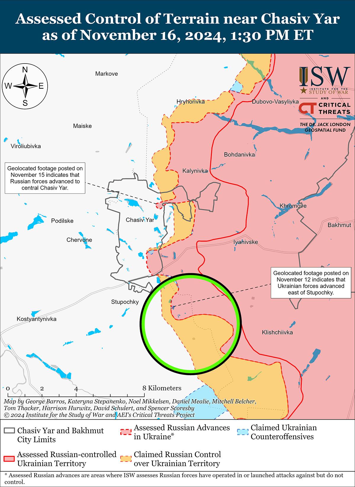 В последнее время российские войска продвинулись на направлении Часов Яр на фоне продолжающихся наступательных действий в этом районе 16 ноября. Геолоцированные кадры, опубликованные 15 ноября, указывают на то, что российские войска недавно продвинулись к улице Дубровского вдоль узкого выступа в центре Часов Яра. [47] 16 ноября российские войска вели наступательные действия к югу от Часов Яра в районе Белой Горы. [48] Сообщается, что в районе Часов Яра действуют подразделения 98-й воздушно-десантной дивизии (ВДВ) и бригады «Север-В», а также операторы беспилотников отряда спецназа «Охотник» (51-я ОА, бывший 1-й АК Донецкой Народной Республики [ДНР]). [49]