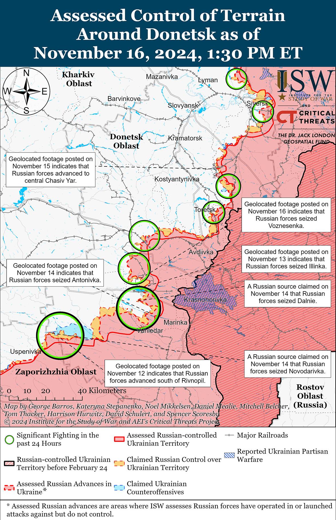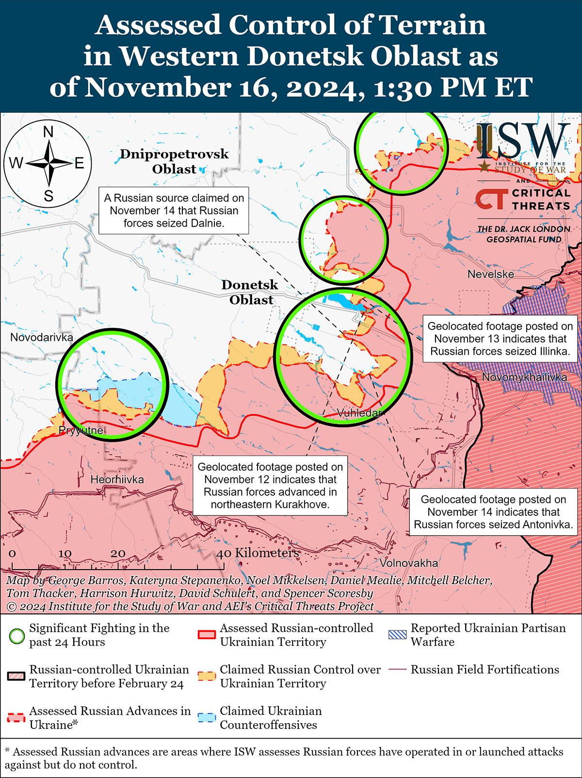 В последнее время российские войска продвинулись на Покровском направлении на фоне продолжающихся наступательных действий в этом районе 16 ноября. На геолоцированных кадрах, опубликованных 16 ноября, виден российский флаг, развевающийся на западе Григорьевки (к юго-востоку от Покровска и к западу от Селидово), что указывает на то, что российские войска недавно захватили населенный пункт. [53] Министерство обороны РФ утверждало, что российские войска захватили Григорьевку, а российские источники утверждали, что населенный пункт захватили подразделения «Черных гусар» 15-й мотострелковой бригады РФ (2-я ОА, Центральный военный округ). [54] Российские военные блогеры утверждали, что российские войска также продвинулись вблизи Новоалексеевки, Пустынки и Юрьевки (все к западу от Селидово), однако в ISW не обнаружили подтверждения этих заявлений. [55] 15 и 16 ноября враг вел наступательные действия к востоку от Покровска в районе Проминя, Миролюбовки и Крутого Яра и к юго-востоку от Покровска в районе Лысовки, Петровки, Новоалексеевки и Пустынки. [56] Сообщается, что подразделения 11-й воздушной армии и армии противовоздушной обороны России (ВКС России и Восточного военного округа) действуют в районе Сухого Яра (к юго-востоку от Покровска). [57]