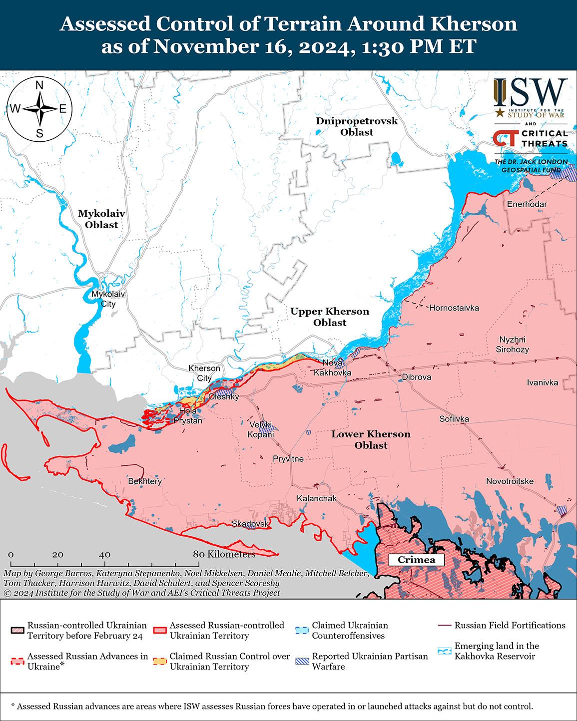 16 ноября на Днепровском направлении на восточном (левом) берегу Херсонской области продолжались позиционные бои, изменения линии фронта не происходили. Сообщается, что на Херсонском направлении действуют подразделения российского 1445-го мотострелкового полка (как сообщается, мобилизованной части) и 45-й бригады спецназа (Главное управление Генерального штаба России). [79] 16 ноября Южное оперативное командование Украины опубликовало геолоцированные кадры, на которых запечатлен украинский удар по российскому командному пункту в оккупированной Челбурде (к северу от Раденска и к востоку от Херсона). [80]
