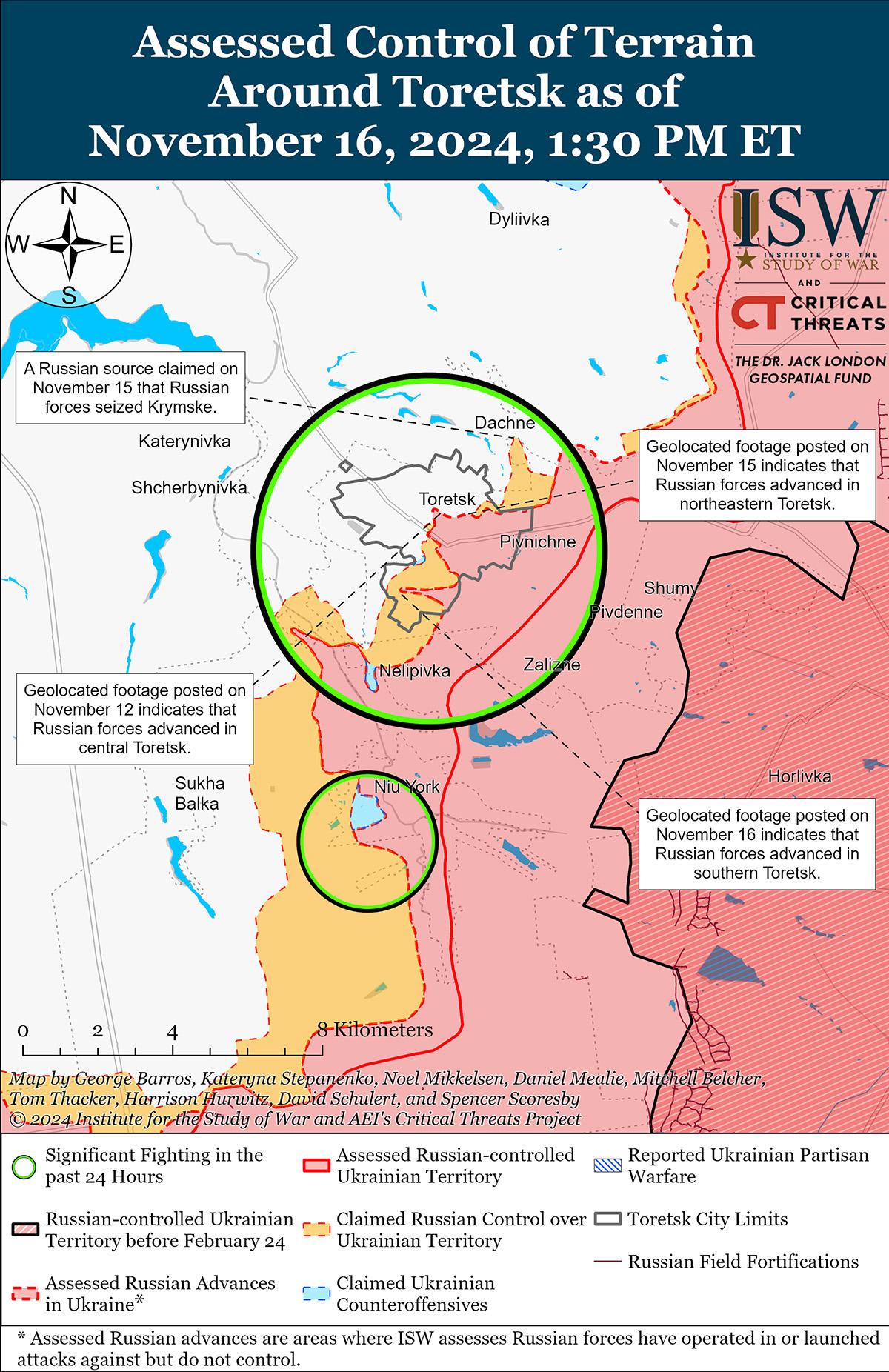 В последнее время российские войска продвинулись на Торецком направлении на фоне продолжающихся наступательных действий в этом районе 16 ноября. На геолоцированных кадрах, опубликованных 15 и 16 ноября, видно, что в последнее время российские войска продвинулись вдоль улицы Набережной и до улицы Променева на юге Торецка. [50] Российский военный блогер утверждал, что российские войска также продвинулись к улице Гаврилова на северо-востоке Торецка и захватили Крымское (северо-восток от Торецка), однако ISW не обнаружил подтверждения этих заявлений. [51] 15 и 16 ноября враг вел наступательные действия вблизи Торецка, к северу от Торецка в районе Дилиевки и к западу от Торецка в районе Щербиновки. [52]