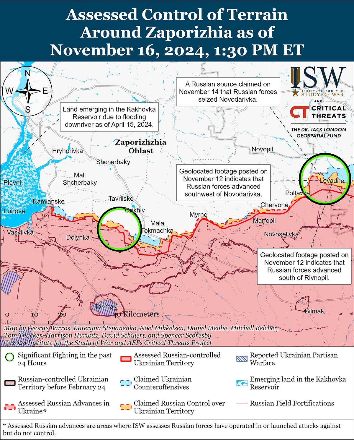 16 ноября российские войска продолжили наступательные действия в приграничье Донецкой и Запорожской областей, однако изменения линии фронта не подтверждены. Минобороны РФ заявило, что российские войска захватили Макаровку (к югу от Великой Новоселки), а российский военный блогер заявил, что российские войска продвинулись в сторону Новодаровки (к юго-западу от Великой Новоселки), но ISW не обнаружил подтверждения этих заявлений. [71] Российский источник утверждал, что подразделения 60-й мотострелковой бригады (5-я ОА) удерживают позиции в большей части Макаровки, но российским войскам еще предстоит зачистить северную часть населенного пункта. [72] 15 и 16 ноября враг вел наступательные действия к юго-западу от Великой Новоселки в районе Новодаровки и Ровнополя. [73] Российские источники утверждали, что украинские войска безуспешно контратаковали в неустановленных районах на направлении Времовки. [74] 15 ноября представитель украинской бригады, действовавшей на Времовском направлении, сообщил, что российские войска пытаются захватить всю территорию на юге Донецкой области и продвинуться на север. [75]
