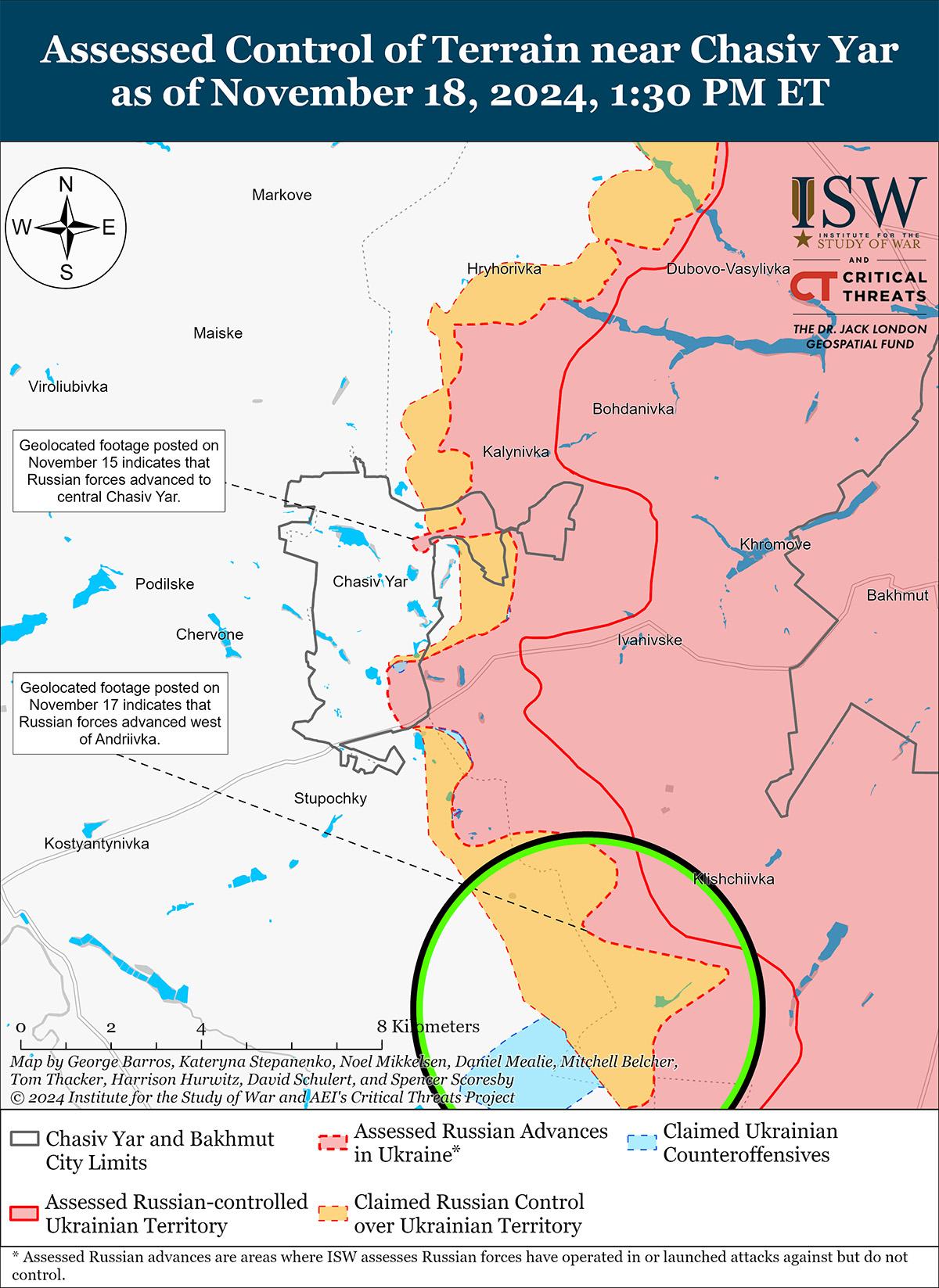 18 ноября враг продолжил наступательные действия на направлении Часова Яра, но не продвинулся вперед. 17 и 18 ноября враг вел наступательные действия в районах населенных пунктов Часов Яр и к югу от Часова Яра в районе Белой Горы. [43] Сообщается, что подразделения 98-й воздушно-десантной дивизии (ВДВ) действуют в районе Часова Яра. [44] Сообщается, что подразделения 6-й мотострелковой дивизии (3-й армейский корпус [АК]) отразили украинскую контратаку в районе канала Северский Донец – Донбасс к юго-востоку от Часова Яра. [45]