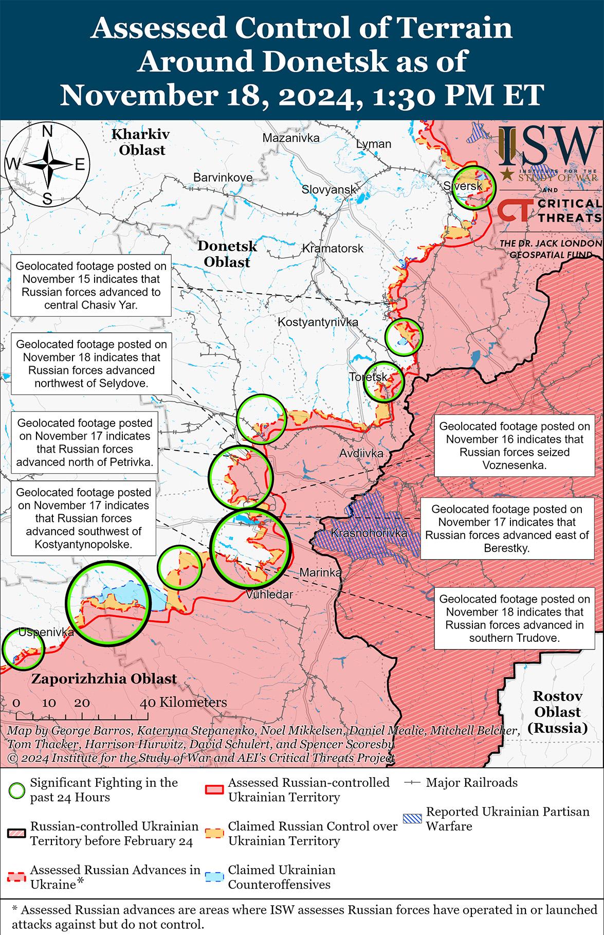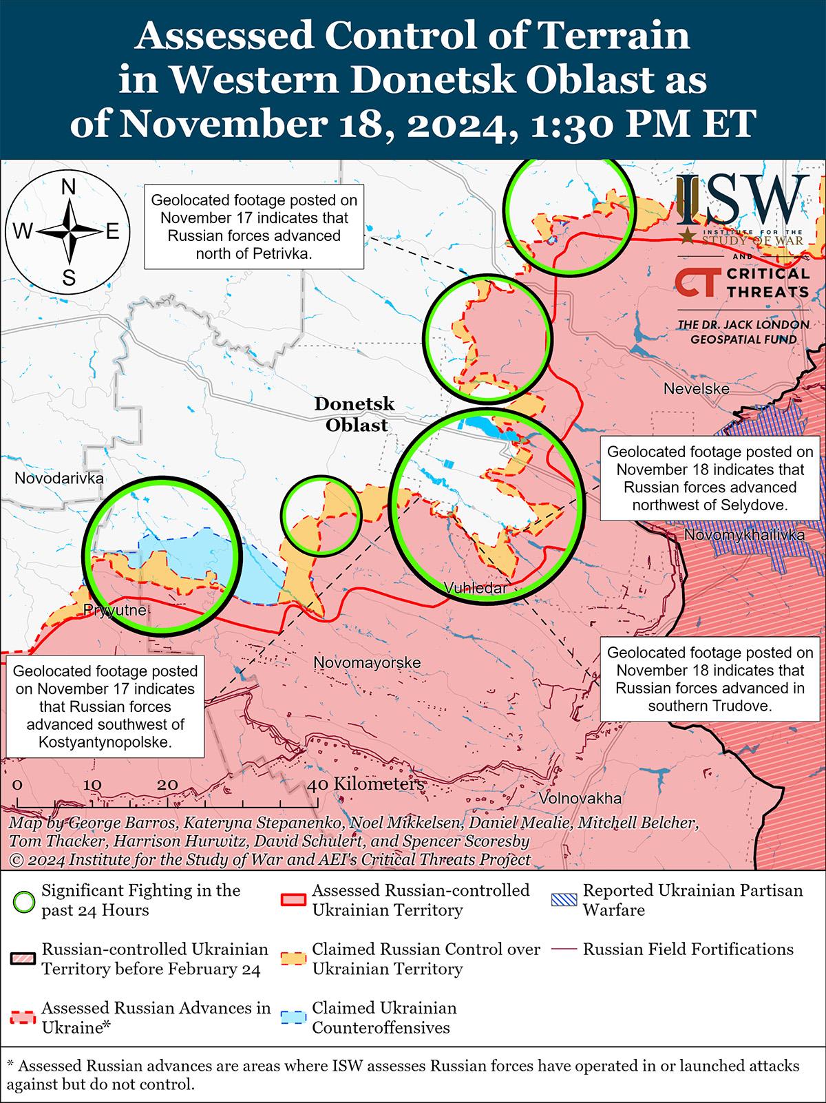 В последнее время российские войска продвинулись на Покровском направлении на фоне продолжающихся наступательных действий на этом направлении 18 ноября. Геолоцированные кадры, опубликованные 17 и 18 ноября, свидетельствуют о том, что российские войска в последнее время продвинулись к северо-западу от Селидово (к юго-востоку от Покровска) и к северу от Петровки (к югу от Покровска и к западу от Селидово). [48] 18 ноября Министерство обороны РФ заявило, что российские войска захватили Новоалексеевку (к юго-востоку от Покровска), которую, по оценкам ISW, российские войска захватили по состоянию на 7 ноября. [49] Российские военные блогеры утверждали, что российские войска продвинулись дальше к северу от Петровки, к северу от Григорьевки и к югу от Лысовки (оба к юго-востоку от Покровска). [50] Однако ISW не обнаружил подтверждения этих заявлений. Враг продолжил наступательные действия к востоку от Покровска в районах населенных пунктов Проминь, Крутой Яр и Миролюбовка; южнее Покровска в районе Петровки; и юго-восточнее Покровска в районе Лысовки, Новоалексеевки, Григорьевки и Пустынки 17 и 18 ноября. [51] Российский военный блогер заявил 18 ноября, что украинские войска недавно безуспешно контратаковали в районе Новогродовки (к юго-востоку от Покровска). [52] Сообщается, что в районе Григоровки действуют подразделения российского 1437-го мотострелкового полка (15-я мотострелковая бригада, 2-я ОА, Центральный военный округ). [53] Сообщается, что подразделения 30-й мотострелковой бригады (2-й ОА) и 35-й мотострелковой бригады (41-й ОА) действуют вблизи Новогродовки. [54]