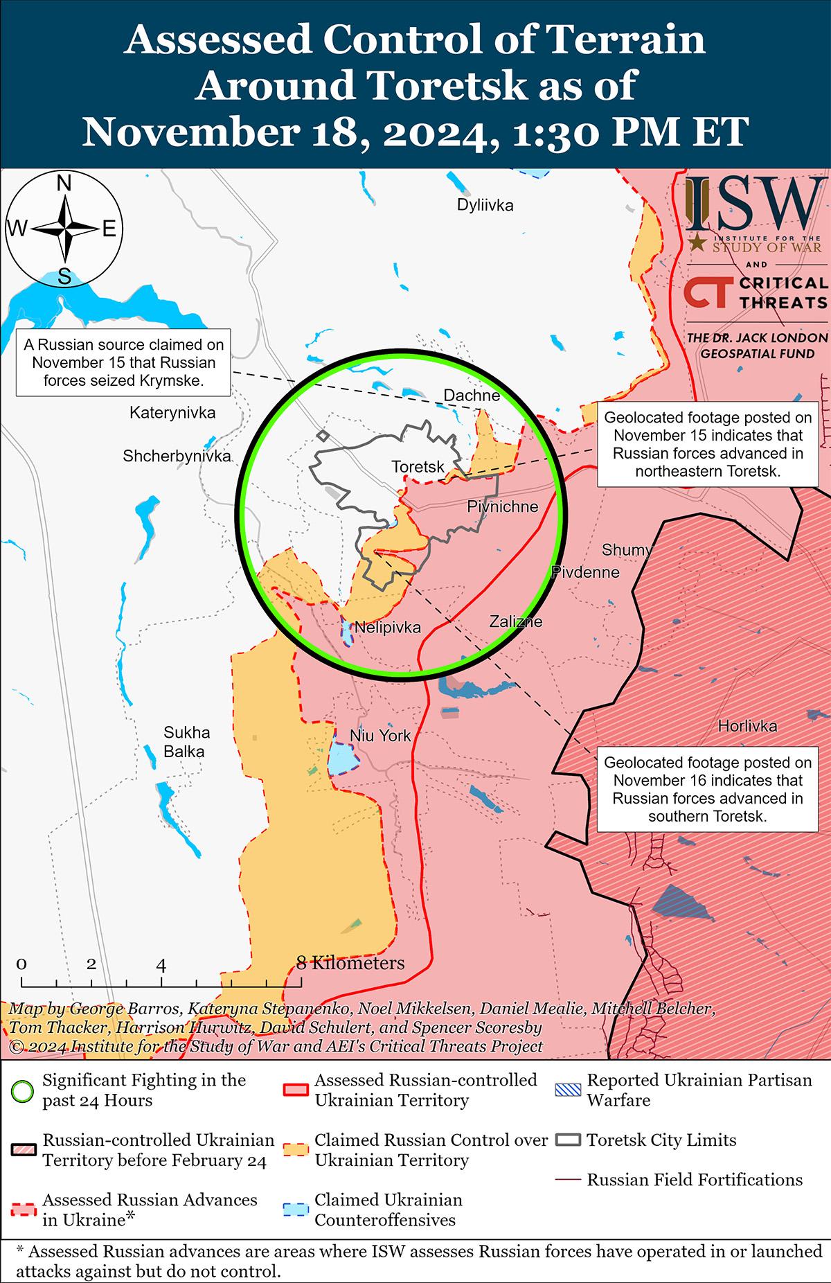 18 ноября враг продолжил наступательные действия на Кураховском направлении, но подтвержденных успехов не достиг. Российский военный блогер заявил, что российские войска продвинулись в районе Зори (к северо-востоку от Курахово), хотя ISW не обнаружил визуальных доказательств этого утверждения. [55] Российские военные блогеры утверждают, что российские войска пытаются охватить украинские силы, действующие к северу от Курахово, и замкнуть котел в этом районе. [56] Российские войска продолжали наступление в районе Курахово; севернее Курахово в районе Новой Ильинки и Берестки; северо-западнее Курахово в районе Сонцовки и Вознесенки; и к востоку от Курахово в районе Максимильяновки 17 и 18 ноября. [57] Командир взвода украинских беспилотников, действовавший на Кураховском направлении, заявил, что российские войска проводят четыре-пять штурмов в день, в том числе механизированные и пехотные, и что российские войска способны восполнить потери новыми силами. [58] Заместитель командира украинской бригады, действующей на Кураховском направлении, заявил, что российские войска несут большие потери и не эвакуируют погибших с поля боя. [59] Сообщается, что на Кураховском направлении действуют подразделения российской 5-й мотострелковой бригады (51-я ОА). [60]