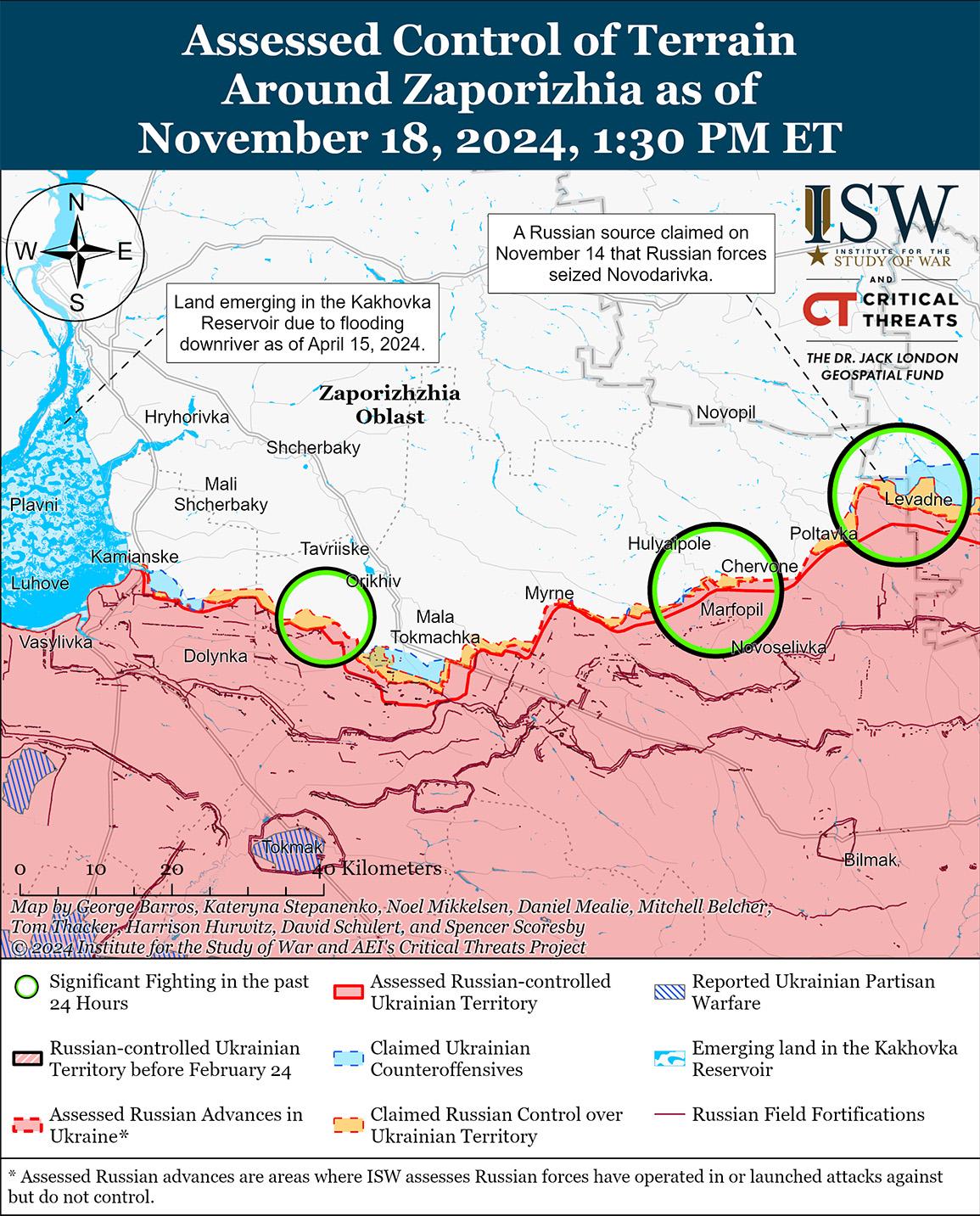 18 ноября российские войска продолжили наземные наступления на западе Запорожской области, но подтвержденных изменений на линии фронта не было. В Генштабе сообщили, что 17 и 18 ноября российские войска продолжили наземные атаки в направлении Новоандреевки (к северо-западу от Работино). [66] Российские источники утверждали, что 17 и 18 ноября российские войска продвигались к Новоандреевке от Нестерянки (к северо-западу от Работино и к югу от Новоандреевки), к южным окраинам Белогорья (к северо-востоку от Работино) и от Новопокровки в направлении Малой Токмачки (оба к северо-востоку от Работино). [67] Однако ISW не обнаружил подтверждения этих российских заявлений. Российский источник утверждает, что бои на Запорожском направлении носят преимущественно позиционный характер, но российские войска активизировались на нескольких неуказанных направлениях. [68] Сообщается, что на Запорожском направлении действуют операторы беспилотников российского 1429-го мотострелкового полка (58-я общевойсковая армия, Южный военный округ). [69]