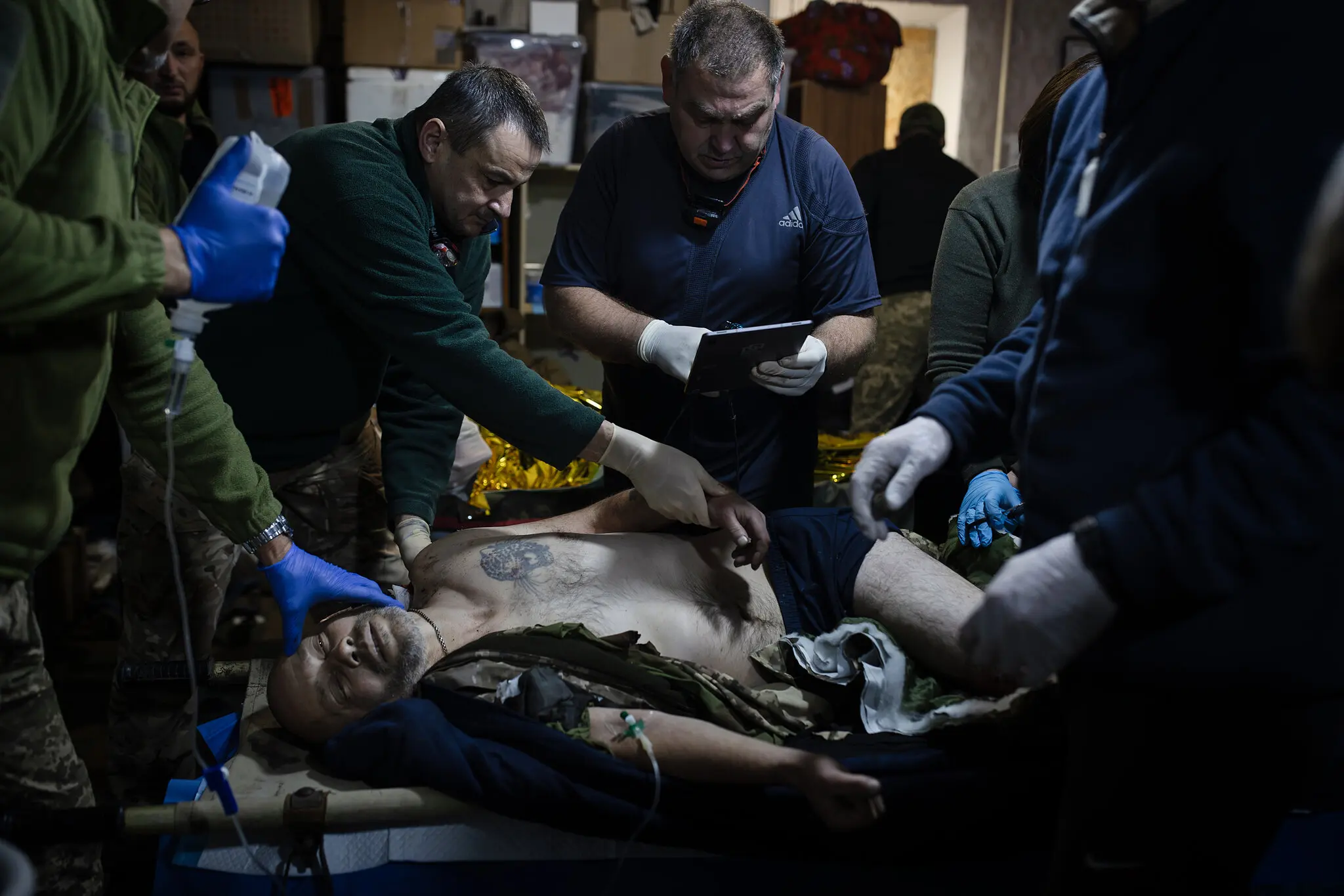 Фельдшеры 110-й отдельной механизированной бригады работают над стабилизацией раненых солдат на линии фронта под Кураково в октябре.