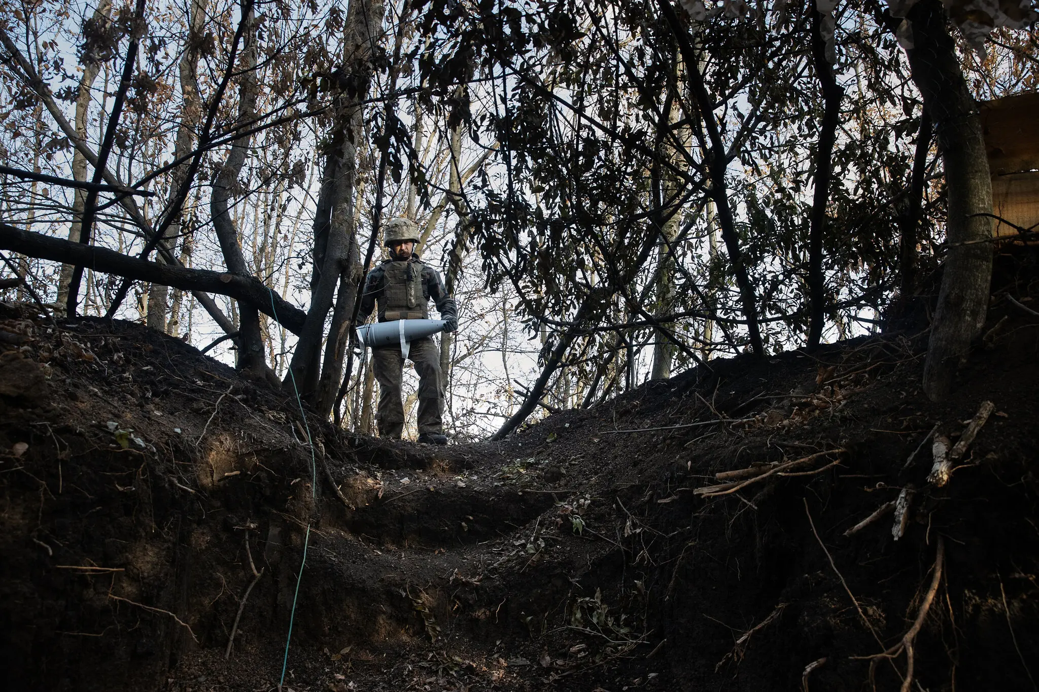 Украинский солдат из 38-й отдельной бригады морской пехоты несет снаряд к полевому орудию, обстреливающему наступающие российские войска в субботу.