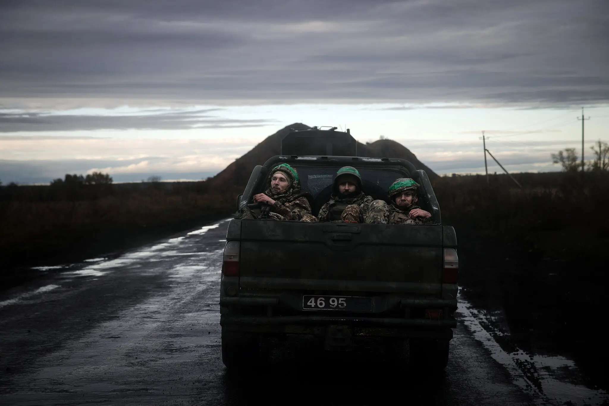 Украинские солдаты едут в кузове пикапа в Андреевке, Украина, в начале ноября.