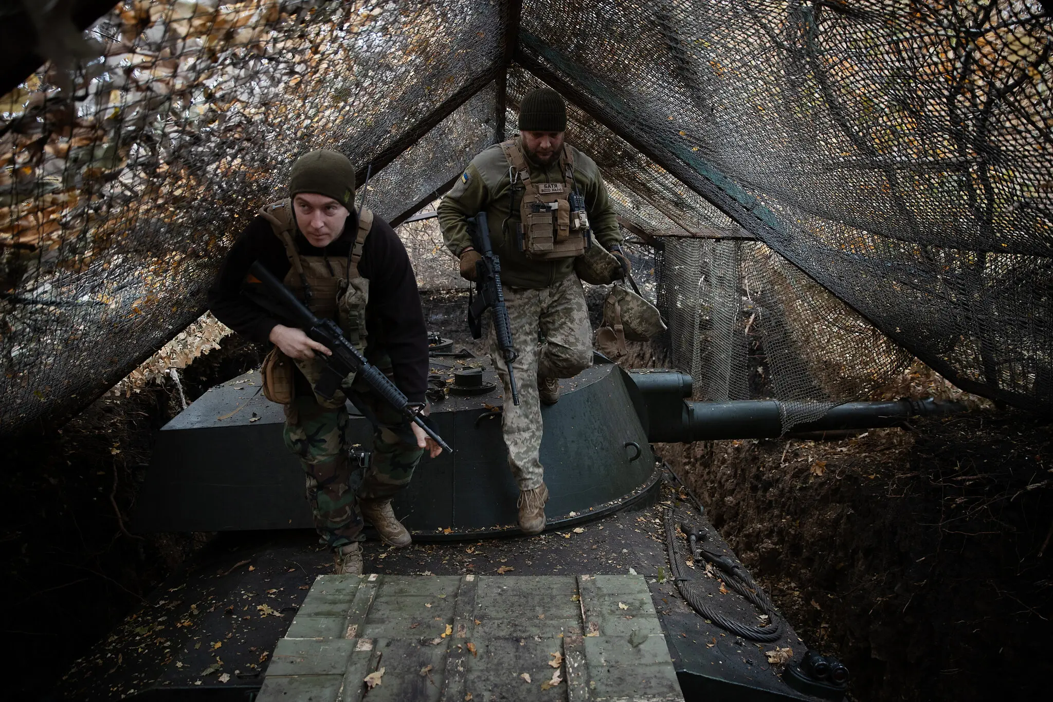 Солдат 38-й отдельной бригады морской пехоты маскируется ветками, чтобы спрятать полевое орудие после стрельбы по российской армии под Покровском в субботу.