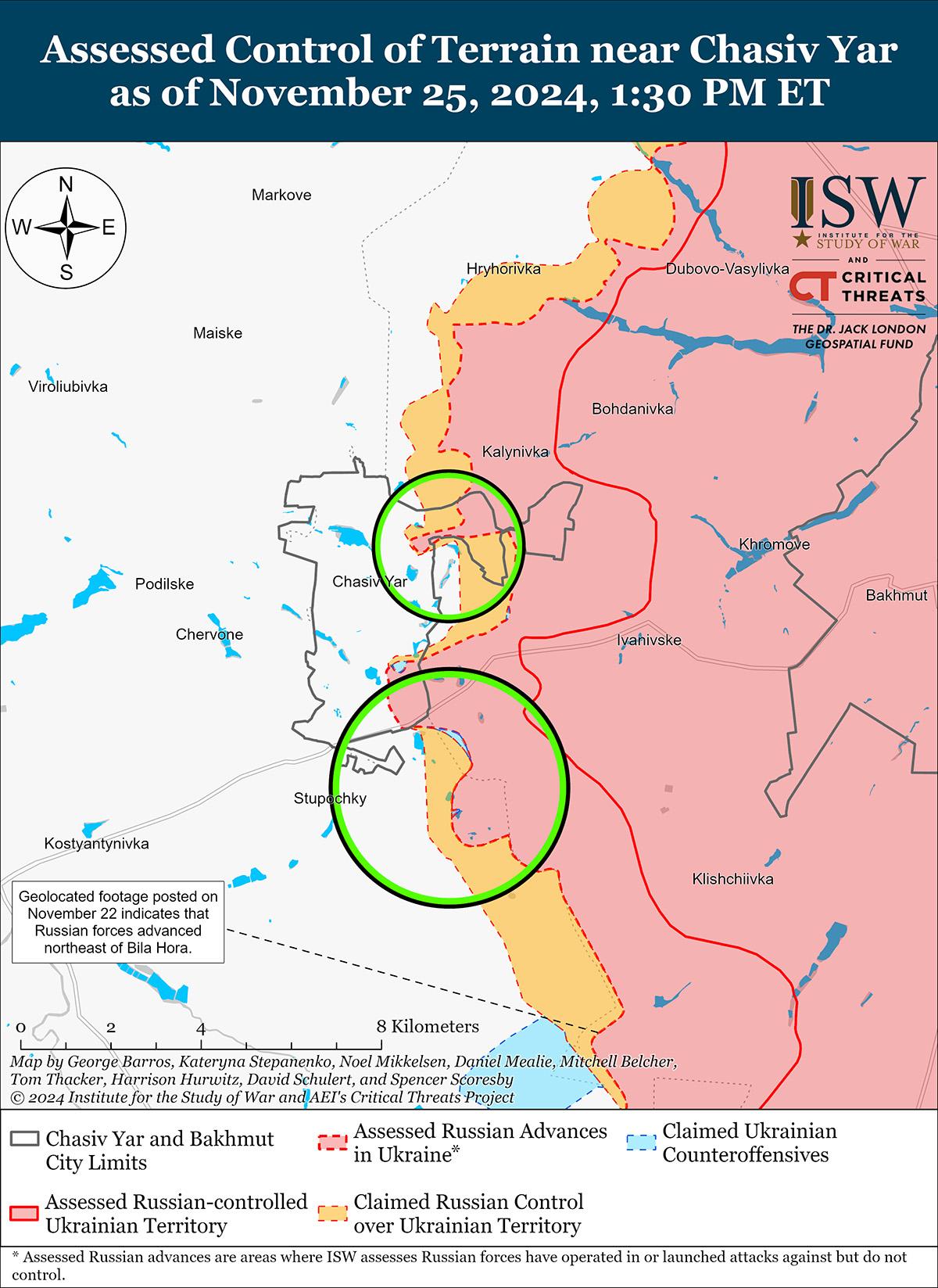 24 и 25 ноября враг продолжал наступательные действия на направлении Часов Яр, но подтвержденных успехов не имел. Российские источники утверждают, что подразделения 98-й воздушно-десантной бригады (ВДВ) ведут бои в промышленной зоне Часова Яра, но неясно, захватили ли они какие-то неуказанные позиции на заводе. [52] Российский военный блогер утверждал, что российские войска продвинулись в районе стадиона в Часовом Яру, периодически заходят в промышленную зону и захватили карьер в районе Ступочки (к югу от Часов Яра). [53] ISW не обнаружил визуальных доказательств, подтверждающих эти максималистские заявления. В украинском Генштабе сообщили, что 24 и 25 ноября враг вел наступательные действия как на флангах Часова Яра, так и в районе Ступочек. [54] Пресс-секретарь Луганской группировки войск майор Анастасия Бобовникова охарактеризовала ситуацию в Часовом Яру как особенно «опасную», поскольку на Краматорском (Часовом Яру) и Северском направлениях началось стягивание значительного количества российских войск, которые применяют различные новые тактические приемы для прорыва украинской обороны в этом районе. [55] По оценкам украинской бригады, действовавшей на направлении Часов Яр, российские войска на направлении Часов Яр могут испытывать нехватку вооружения, поскольку в последнее время они начали использовать в боевых действиях морские системы, такие как противолодочная ракетная установка РБУ-6000 «Смерч». [56] Сообщается, что операторы беспилотников отряда спецназа «Охотник» (51-я общевойсковая армия [ОА], бывший 1-й армейский корпус 1-й Донецкой Народной Республики [ДНР]) действуют в районе Часова Яра. [57]