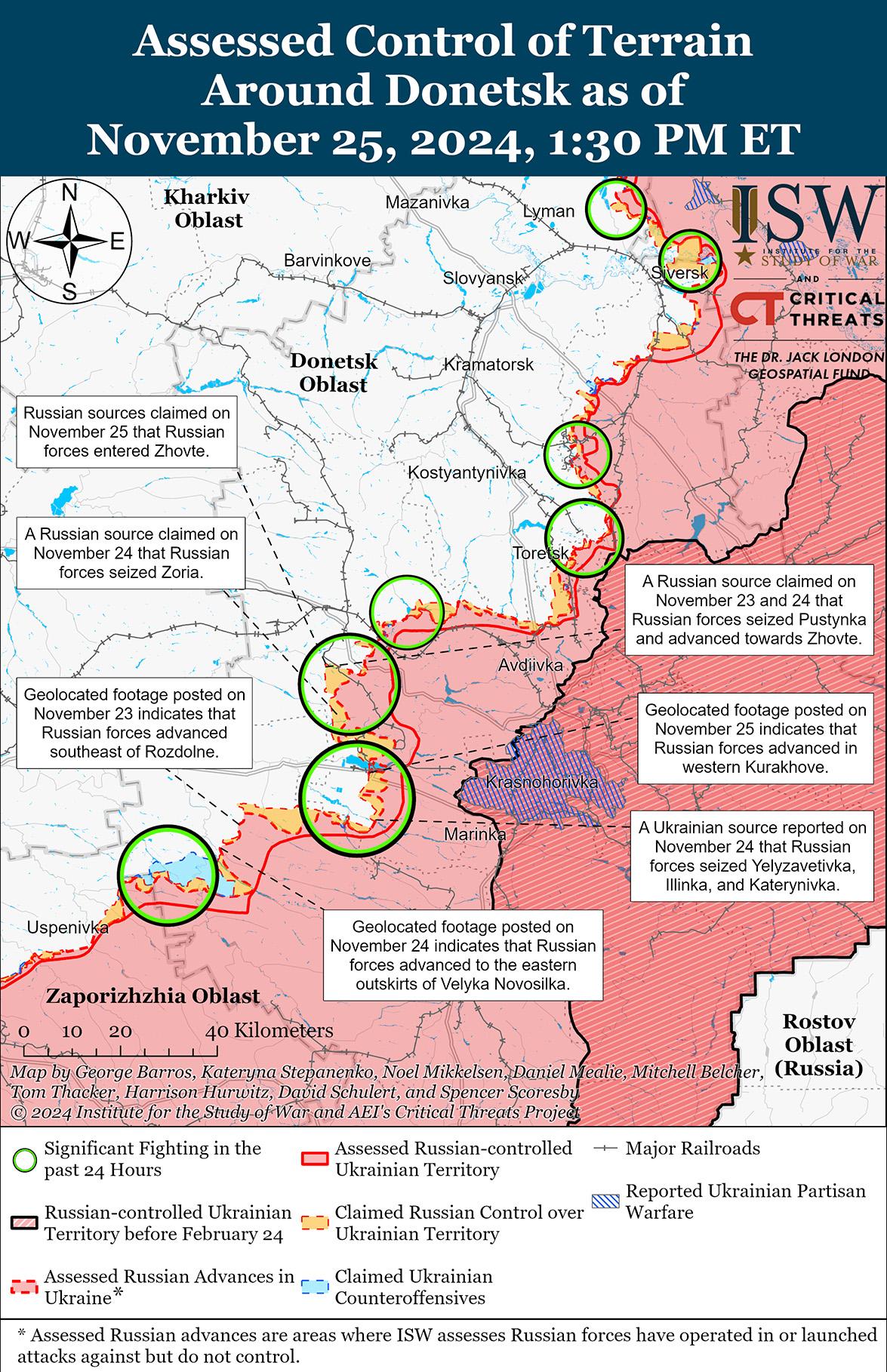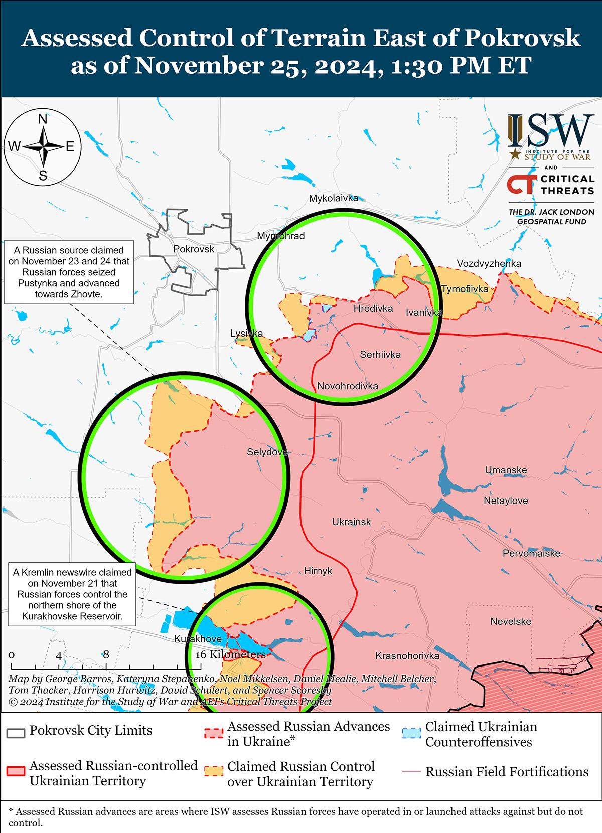 Российские источники утверждают, что российские войска незначительно продвинулись к югу и юго-востоку от Покровска на фоне продолжающихся российских наступательных операций в этом районе 25 ноября. Российские источники утверждали, что российские войска продвинулись к востоку и северо-востоку от Пушкино (к югу от Покровска), к востоку и в центральной части Желтого (к северо-востоку от Пушкино), к юго-западу от Юрьевки (к востоку от Пушкино) и к западу от Пустынки (к северо-востоку от Пушкино). [62] Однако ISW не может независимо проверить эти заявления. 24 ноября украинский батальон сообщил, что начал успешную механизированную контратаку в районе Николаевки (к востоку от Покровска). [63] 24 ноября украинский военнослужащий заявил, что российские войска перебрасывают значительную часть войск из Новоалексеевки (к югу от Покровска и к юго-западу от Селидово) для прорыва в направлении трассы Т0515 Шевченко – Новотроицкое – Ясеновое (юго-западнее Покровска) при поддержке танков. [64] Украинский военнослужащий добавил, что российские войска недавно вышли на окраины Пушкино. Спикер украинской группировки войск «Хортица» подполковник Назар Волошин сообщил, что украинские минные поля уничтожили 30 процентов российской военной техники во время недавних штурмов на Покровском направлении. [65] Сообщается, что российские войска вели наступательные действия к востоку от Покровска в районе Миролюбовки, Николаевки и Проминя; юго-восточнее Покровска в районе Лысовки; и южнее Покровска в районе Григорьевки, Петровки, Даченского, Пустынки, Пушкино, Желтого и Чумацкого. [66]