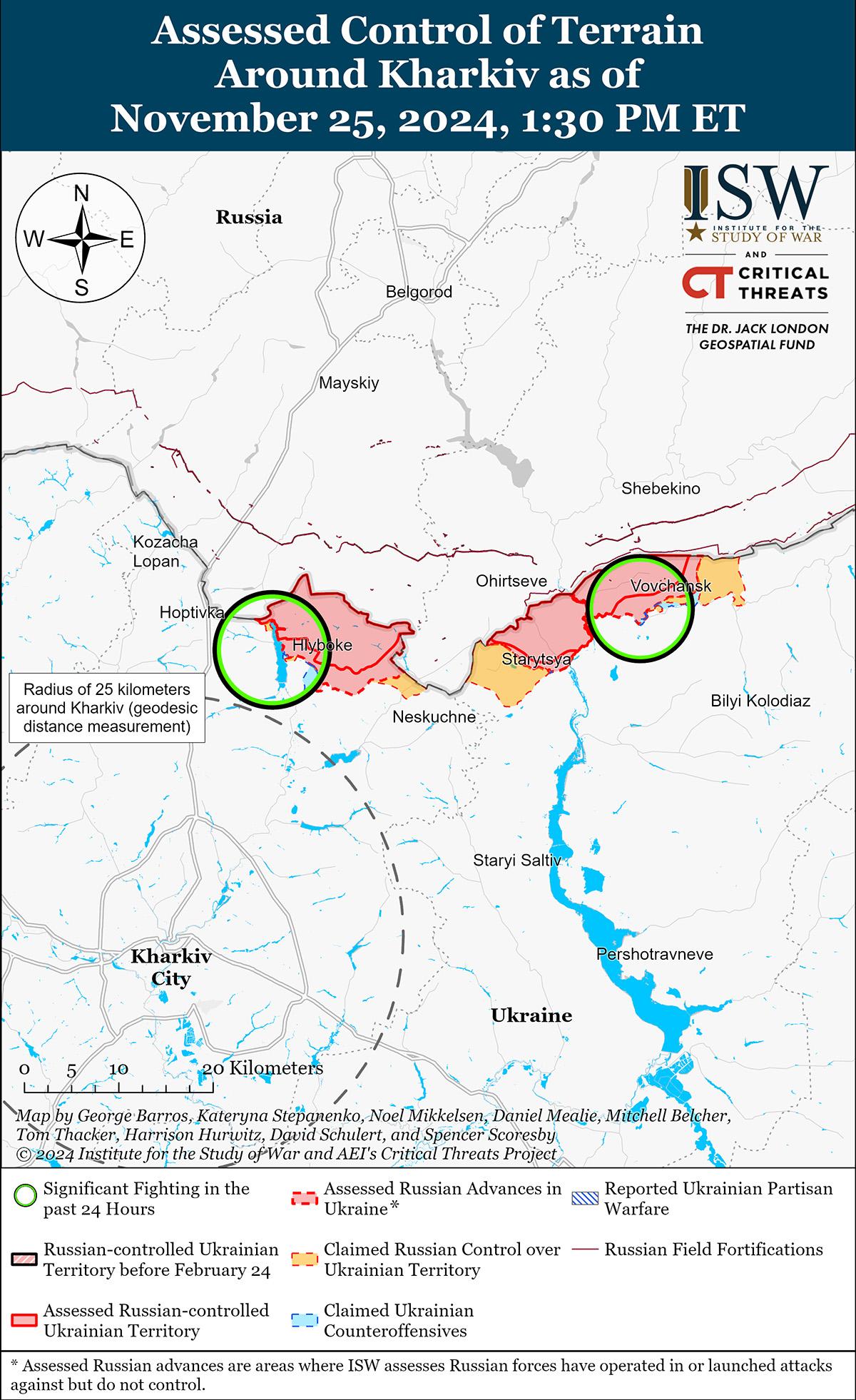 Российские войска незначительно активизировали трансграничные наступления к северо-западу от Харькова на фоне продолжающихся наступательных действий к северо-востоку от Харькова 24 и 25 ноября, но не добились подтвержденных успехов. В Генштабе Украины сообщили, что 24 и 25 ноября российские войска вели наступательные действия вблизи международной границы к северо-западу от Харькова в районе Казачьей Лопани и Кудеевки и к северо-востоку от Харькова в районе Волчанска и Тихое. [41] Российские трансграничные рейды, вероятно, направлены на то, чтобы зафиксировать украинские силы вдоль международной границы на севере Харьковской области и вынудить Украину передислоцировать войска из Курской области, где российские войска в настоящее время ведут интенсивные наступательные операции по возвращению утраченных позиций.