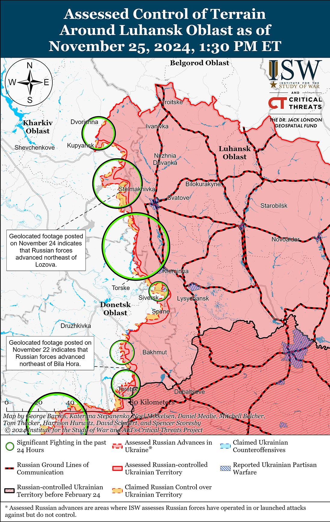 Сообщается, что российские войска форсировали реку Оскол к северу от Купянска на фоне продолжающихся наступательных действий на Купянском направлении 24 и 25 ноября, но ISW пока не обнаружил подтверждения этих заявленных российских продвижений. Российские военные блогеры утверждали, что российские войска на лодках переправились на западный (правый) берег реки Оскол и захватили плацдарм на правом берегу к югу от Новомлинска (к северу от Купянска). [42] Генеральный штаб Украины сообщил, что российские войска вели наступательные действия в районе Сеньково (к югу от Купянска на западном берегу реки Оскол), что позволяет предположить, что российские войска могли активизировать усилия по форсированию реки Оскол к югу от Купянска в районе Крутяковко-Колесниковского выступа. [43] Тем не менее, ISW не зафиксировал подтвержденных российских продвижений через реку Оскол ни к югу от Новомлынска, ни в районе Сеньково. Российский военный блогер заявил, что российские войска атакуют рядом с комбикормовым заводом, сахарным заводом и молочным консервным заводом в восточном Купянске. [44] Командир украинского батальона, действовавшим на Купянском направлении, сообщил, что украинские войска наносят потери в этом направлении в соотношении 1 к 5 и что на этом направлении враг пытается захватить плацдарм на правом берегу реки Оскол. [45] Командир украинского батальона заявил, что действия украинских беспилотников не позволяют российским войскам проводить механизированные атаки в пределах 12 км от линии фронта, а российская пехота в основном продвигается в пешем порядке на Купянском направлении. Враг продолжил наземные атаки к северу от Купянска в районе Новомлынска и Голубовки; к юго-востоку от Купянска в районах населенных пунктов Песчаное, Лозовая, Загрызово, Новоосиновое, Колесниковка, Крутяковка; и южнее Купянска в районе Сеньково. [46]