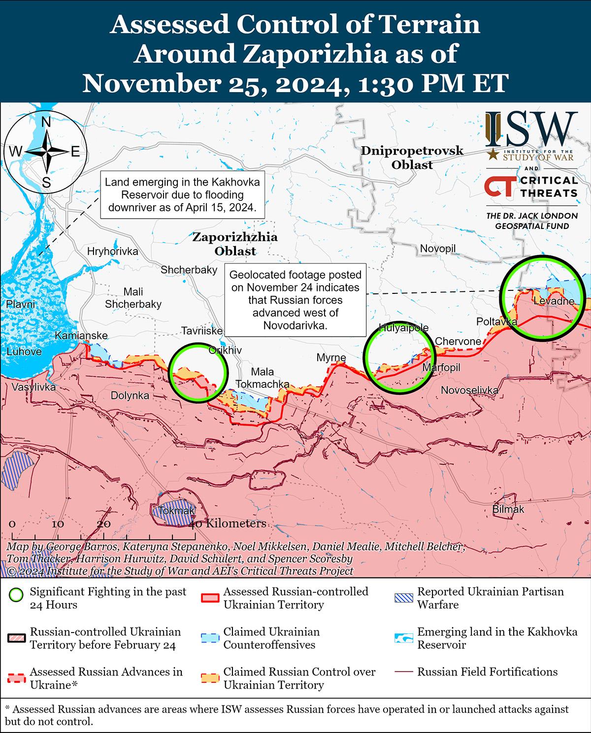 Источники в украинском военном командовании ранее заявляли, что украинское вторжение в Курскую область помешало российским войскам начать крупную наступательную операцию в Запорожской области в последние месяцы, что соответствует заявлениям украинского командира батальона. [23] Ранее в ISW поступали сообщения о том, что российское военное командование передислоцировало войска из западной части Запорожской области для реагирования на вторжение на Курской дуге в августе 2024 года. [24]Спикер Таврийской группировки войск полковник Владислав Волошин 11 ноября предупредил, что российские войска перебрасывают подготовленные штурмовые группы на передовые позиции в оккупированной Запорожской области, но неясно, намерены ли российские военные проводить единую наступательную операцию или отдельные локальные штурмы. [25] Позже 24 ноября Волошин отметил, что российские войска не перебрасывают крупные группировки войск на Запорожское направление, а перебрасывают небольшие подразделения штурмовой техники или операторов беспилотников из Донецкой области, чтобы активизировать российские атаки на юге. [26] Ранее Волошин заявлял, что российские войска концентрируются в районах Каменского (к северо-западу от Работино и к югу от Запорожья), Гуляйполе (к северо-востоку от Работино) и самого Работино и готовятся к усиленным штурмам в этих районах. [27] В начале октября 2024 года ISW также наблюдал активизацию российских действий в районе Каменского. [28]