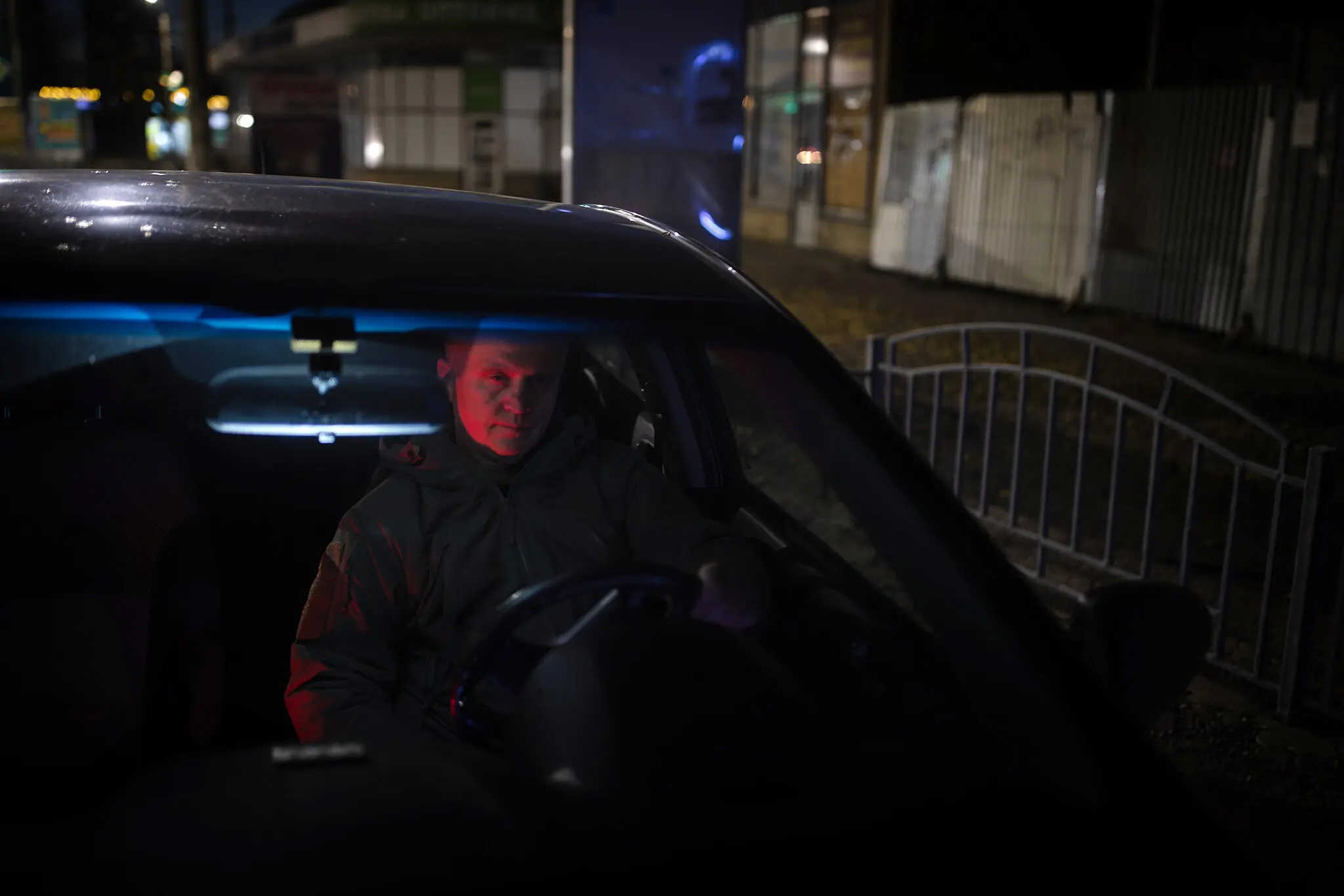 Владимир Никулин, украинский полицейский, сидит в том, что он называет своей «счастливой», хотя и побитой машине, в Славянске, Украина, в этом месяце Фото…Тайлер Хикс/Нью-Йорк Таймс