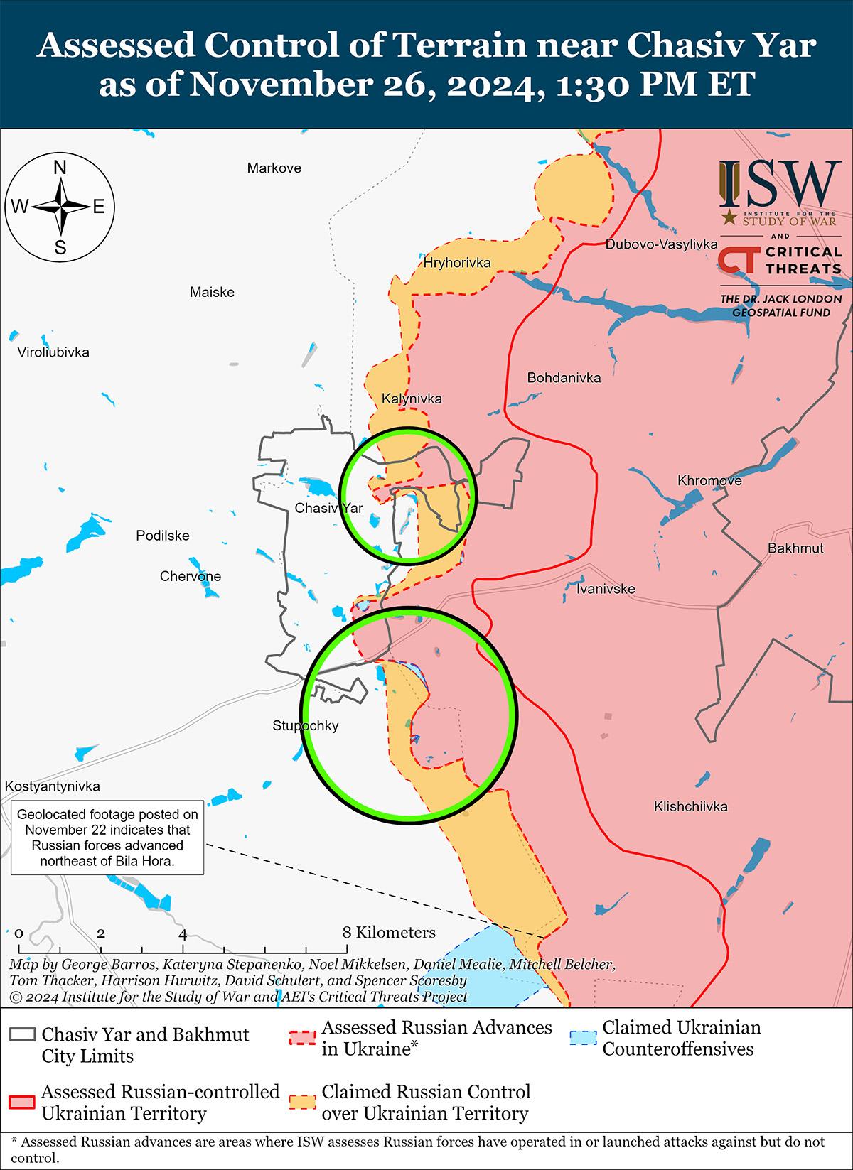 25 и 26 ноября Генштаб Украины сообщил, что российские войска продолжают наступательные действия вблизи Часова Яра и Ступочков (к югу от Часов Яра). [52] По словам российского военного блогера, российские войска пытаются проникнуть на огнеупорный завод в центре Часова Яра, но с трудом пытаются закрепиться на южной окраине завода. [53] Представитель украинской бригады, действующей в районе Часова Яра, заявил 26 ноября, что российские войска предпочитают развертывать небольшие огневые группы пехоты в составе двух-пяти солдат в ответ на использование украинскими войсками беспилотников в районе канала Северский Донец -«Донбасс» для проникновения в тыл украинских сил. [54] 26 ноября командир украинской роты сообщил, что, несмотря на большие потери, российские войска по несколько раз в день пытаются пересечь канал Северский-Донец. [55] Командир роты также отметил, что российские войска не пытаются пересечь канал ночью из-за низких температур, которые идут на пользу украинским тепловизионным беспилотникам, а предпочитают пытаться переправиться на рассвете или днем. Сообщается, что подразделения российской 98-й воздушно-десантной дивизии (ВДВ) продолжают действовать в районе Часова Яра. [56]