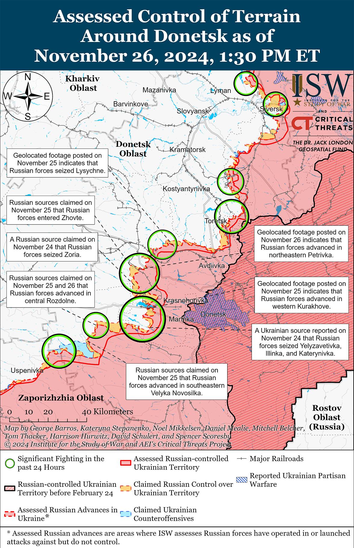 Темпы наступления российских вооруженных сил с осени 2024 года в последнее время заметно увеличились по сравнению с темпами наступления в 2023 году и до конца 2024 года, но недавние сообщения западных СМИ, сравнивающие недавние успехи России с теми, что были в начале полномасштабного вторжения России, продолжают неверно характеризовать постепенный и тактический характер недавних достижений России.[4] ISW оценивает, что российские силы продвинулись на 574 квадратных километра — в среднем 22 квадратных километра в день. Это значительно меньше, чем 1265 квадратных километров в день, которые, по оценкам ISW, российские силы наращивали в марте 2022 года. Сообщение Reuters от 26 ноября о том, что российские силы «контролируют» более 80 процентов Донецкой и Луганской областей, также вводит в заблуждение.[5] По оценкам ISW, в то время как российские войска оккупируют примерно 99% территории Луганской области, российские войска оккупируют только около 66% территории Донецкой области. С осени 2022 года российские войска оккупировали почти всю Луганскую область, но за время войны оккупировали значительно меньшую территорию в Донецкой области. По недавним оценкам ISW, российским войскам все еще необходимо захватить более 8 000 квадратных километров территории, чтобы достичь определенной Кремлем цели по захвату территории Донецкой области. [6] Российские войска захватят оставшуюся часть Донецкой области примерно за год, если российские войска продолжат свое недавнее относительно более быстрое наступление, что не является фактом. Российские войска в частности, обходят украинские опорные пункты, и у Украины все еще есть несколько хорошо защищенных городов в Донецкой области, таких как Славянск и Краматорск, которые российские войска, вероятно, не смогут захватить так же быстро, как они захватили сельские поля под Покровском. ISW продолжает оценивать, что российские войска не смогли восстановить оперативный маневр на поле боя для глубокого проникновения в украинские позиции, как это было в первые месяцы полномасштабного вторжения. [7] Вместо этого российские войска используют выявленные уязвимые места в украинской обороне для постепенного продвижения. [8]