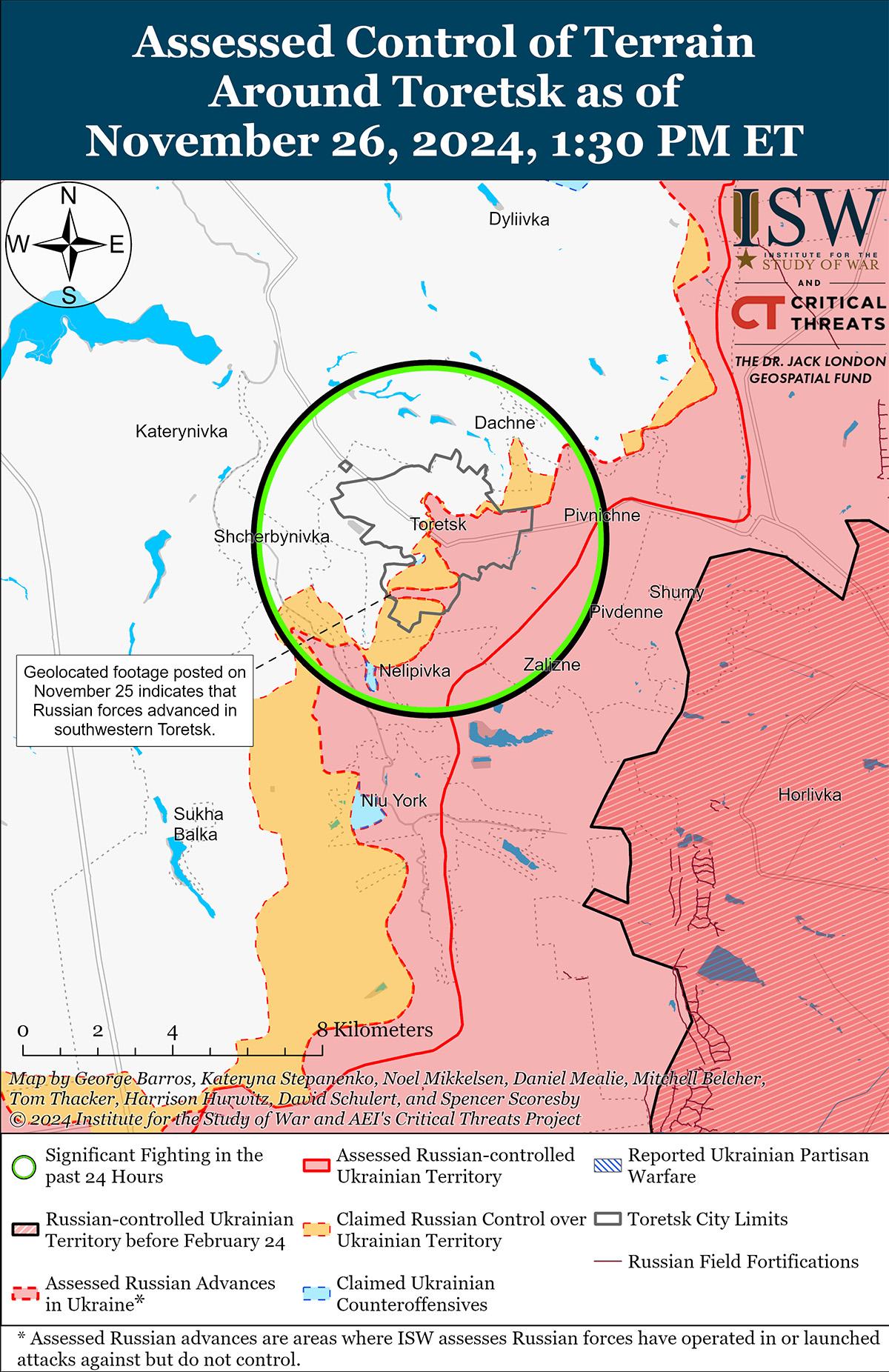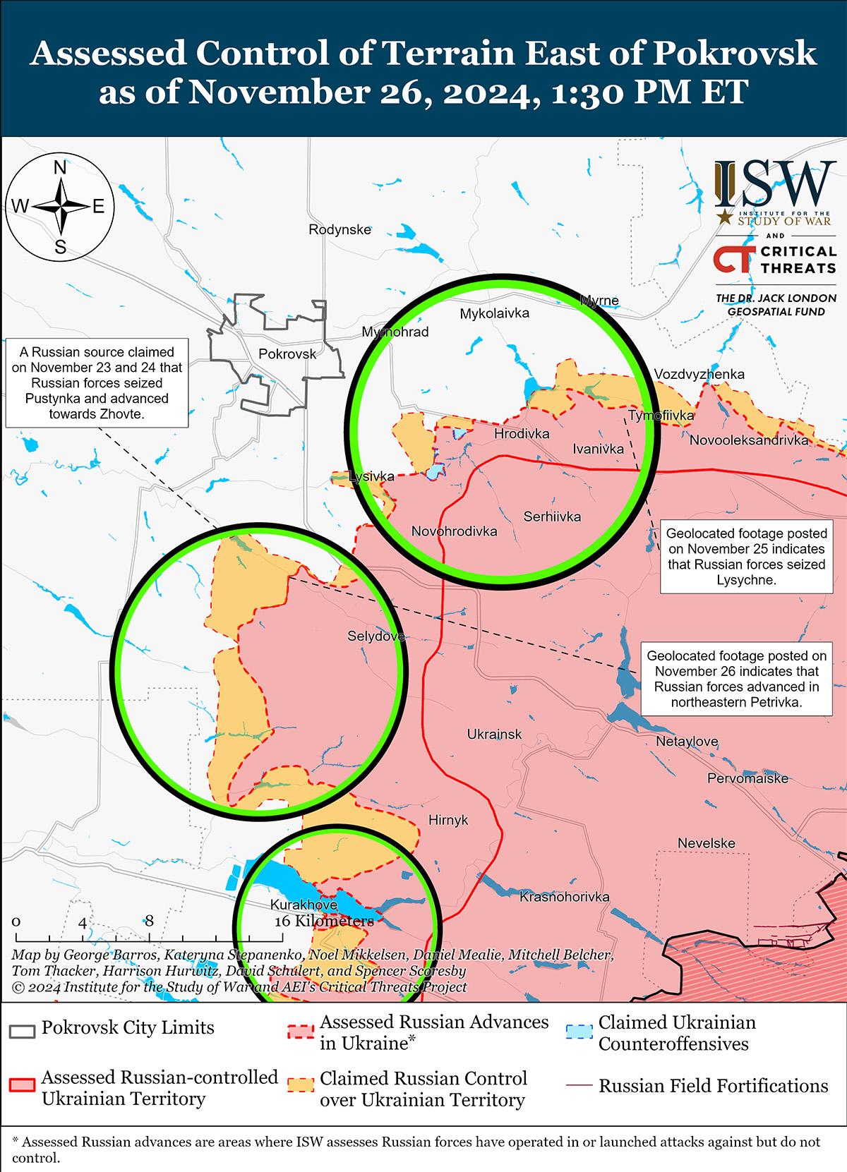 В последнее время российские войска продвинулись на Покровском направлении на фоне продолжающихся наступательных действий в этом районе 26 ноября. Геолоцированные кадры, опубликованные 25 и 26 ноября, указывают на то, что российские войска недавно продвинулись к юго-западу от Юрьевки и на северо-востоке Петровки (оба к югу от Покровска). [59] На дополнительных геолоцированных кадрах, опубликованных 25 ноября, видны действия российских войск к северу от Лисичного (к востоку от Покровска), что указывает на то, что российские войска, вероятно, захватили населенный пункт. [60] Российский военный блогер утверждал, что российские войска продвинулись к окраинам Желтого и в районе Даченского (оба к югу от Покровска), но ISW не обнаружил подтверждения этих заявлений. [61] Российские войска вели наступательные действия к востоку от Покровска в районе Миролюбовки, Проминя и Красного Яра; юго-восточнее Покровска в районе Лысовки; и южнее Покровска в районе Пушкино, Пустынки, Нового Труда, Григорьевки, Петровки и Даченского 25 и 26 ноября. [62] Российский военный блогер утверждал, что российские войска находятся примерно в двух километрах от Мирнограда (к востоку от Покровска). [63] Представитель украинской бригады, действующей на Покровском направлении, сообщил 26 ноября, что российские войска наносят удары беспилотниками с видом от первого лица (FPV), за которыми следуют атаки силами 10–20 человек пять-шесть раз в день. [64] По словам пресс-секретаря, российские войска время от времени используют в атаках бронетехнику, особенно танки. Украинский офицер, действующий на Покровском направлении, 26 ноября сообщил, что российские войска используют технику для переброски личного состава или нанесения ударов по украинским позициям. [65]