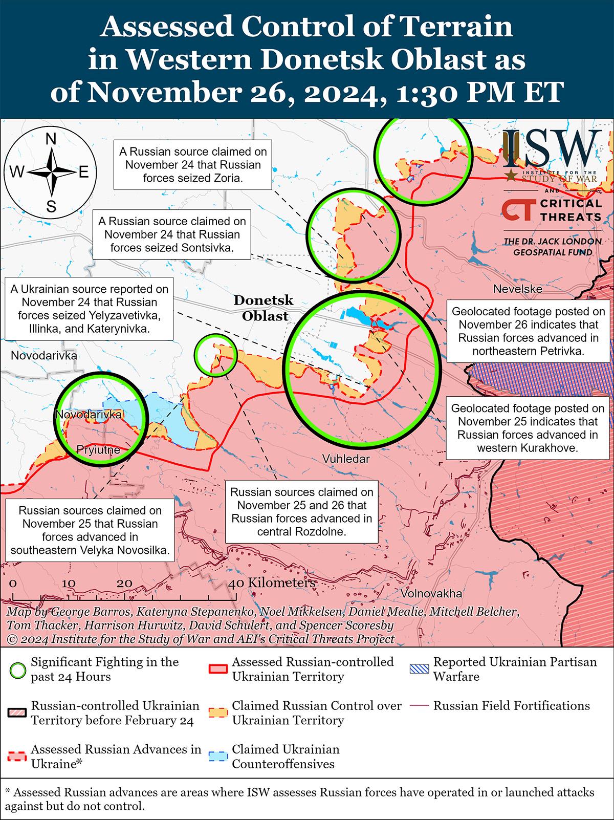 В последнее время российские войска продвинулись в приграничье Донецкой и Запорожской областей на фоне продолжающихся наступательных действий в этом районе 26 ноября. Геолоцированные кадры, опубликованные 26 ноября, свидетельствуют о том, что российские войска недавно продвинулись к юго-востоку от Новодаровки (к юго-западу от Великой Новоселки). [74] Российские военные блогеры утверждали, что российские войска продвинулись в центральной части Роздольного (к северо-востоку от Великой Новоселки) и в восточной части Великой Новоселки, но ISW не обнаружил подтверждения этих заявлений. [75] Российские войска продолжали наступление в районе самой Великой Новоселки; к юго-западу от Великой Новоселки в районе Ровнополя и Новодаровки; и к северо-востоку от Великой Новоселки под Роздольным 25 и 26 ноября. [76]