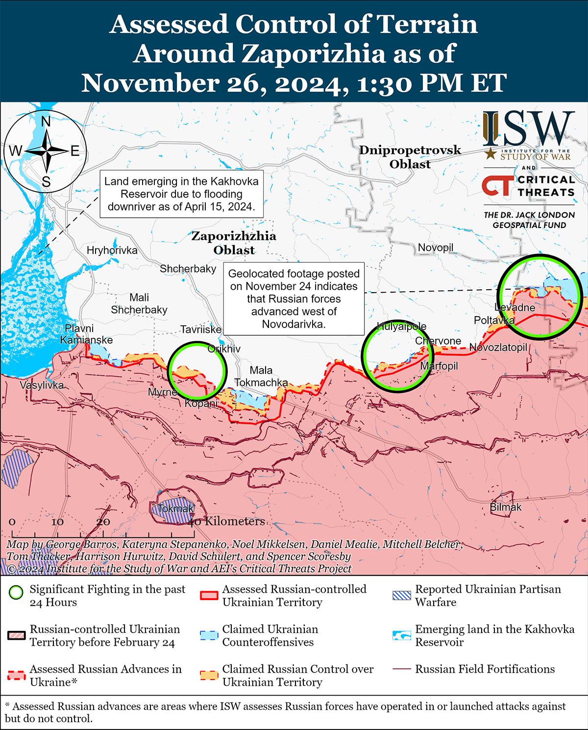 В последнее время российские войска продвинулись на Кураховском направлении на фоне продолжающихся наступательных действий в этом районе 26 ноября. Геолоцированные кадры, опубликованные 25 ноября, свидетельствуют о том, что российские войска недавно продвинулись к северо-западу от Дальнего (к югу от Курахово). [66] Российские военные блогеры утверждали, что российские войска продвинулись в районе Берестки (к северу от Кураховского водохранилища), на 1,5 км вглубь фронта шириной три км у Зори (к северо-западу от Курахово) и на 750 м в глубину на юго-восточных окраинах Курахово. [67] Однако ISW не обнаружил подтверждения этим заявлениям. Российские войска провели наступательные операции к северо-западу от Курахово в районе Сонцовки, Новодмитривки и Зари; к северу от Курахово в районе Берестки; около самого Курахово; и к югу от Курахово в районе Дальнего 25 и 26 ноября.[68] Представитель украинской Хортицкой группы войск подполковник Назар Волошин заявил 26 ноября, что российские войска пытаются взять Курахово и близлежащие украинские наземные линии коммуникаций (НЛК) под огневой контроль и что украинские войска сохраняют контроль над Курахово.[69] Сообщается, что в Курахово действуют подразделения российской 5-й мотострелковой бригады (51-я ОА). [70]
