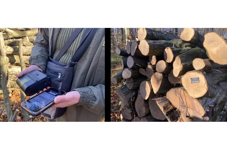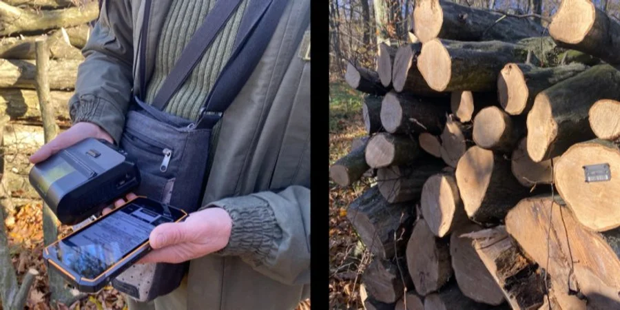 Нам показують, як виглядає відправка. Спочатку у лісі складають деревину. Саме на згруповані колоди спеціальним молотком набивають пластикову бирку, яка має штрихкод та унікальний набір цифр, який можна перевірити онлайн. У бирці зашифрована інформація про сорт, породу деревини, її об’єм та лісокористувача. Після того, як бирку зафіксували, її неможливо використати вдруге. Проте, забігаючи наперед, скажемо, що на десятках опрацьованих нами накладних ми бачили, що бирку спеціально не прибивають, а просто фотографують на коліні.