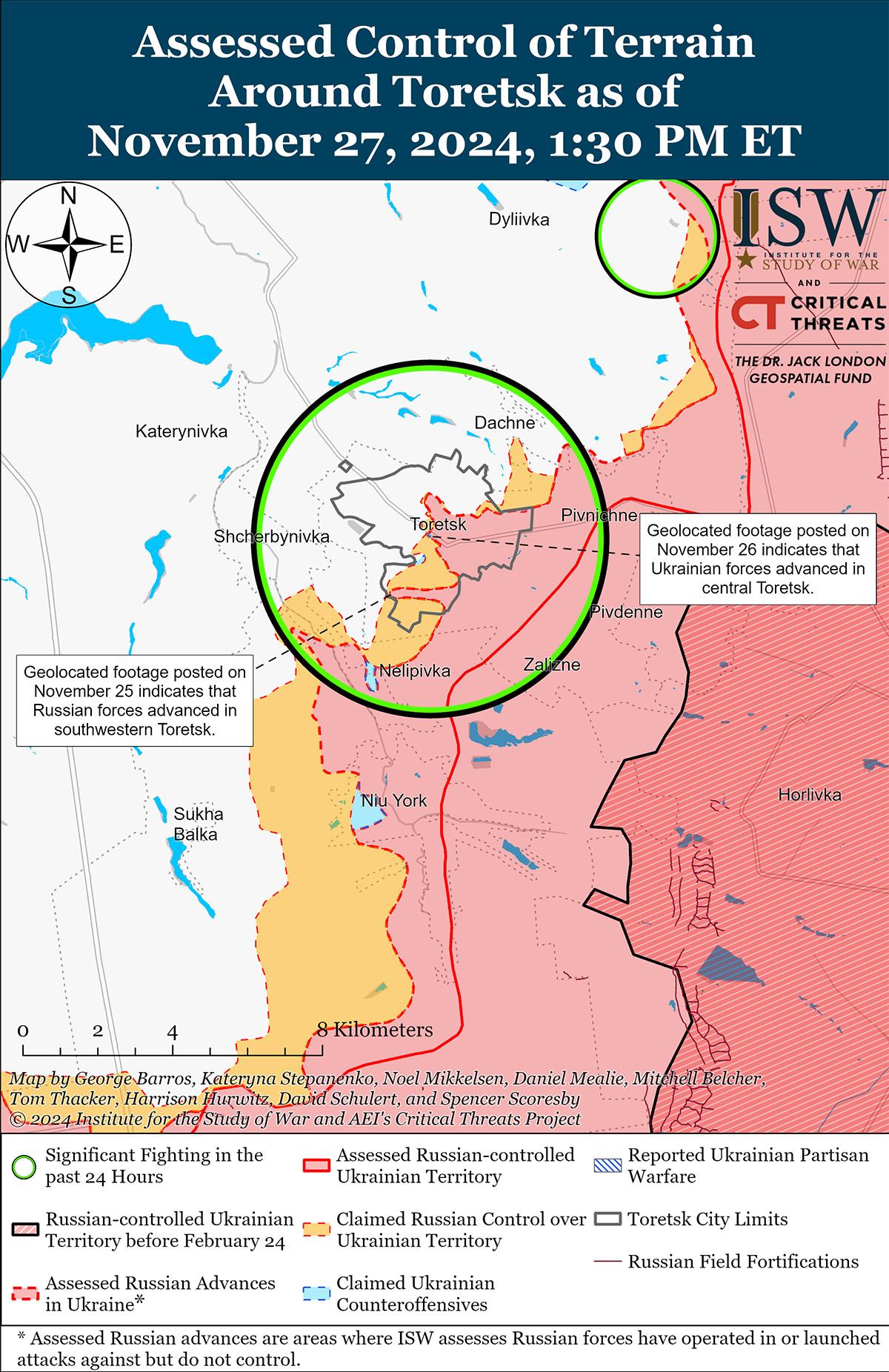 На фоне продолжающихся российских наступательных действий на Торецком направлении 27 ноября украинские войска вернули себе позиции в Торецке. Геолоцированные кадры, опубликованные 26 ноября, указывают на то, что украинские войска недавно вернули себе позиции в центре Торецка. [40] Командир украинского батальона, действовавшего на Торецком направлении, заявил 27 ноября, что российские войска в этом районе теряют около 100 человек в день и что они регулярно меняют направление и методы атаки, пытаясь проникнуть в Торецк с флангов. [41] Генеральный штаб Украины сообщил, что российские войска вели наступательные действия под самим Торецком; северо-восточнее Торецка в районе Дилиевки; и западнее Торецка в районе Щербиновки с 26 по 27 ноября. [42]