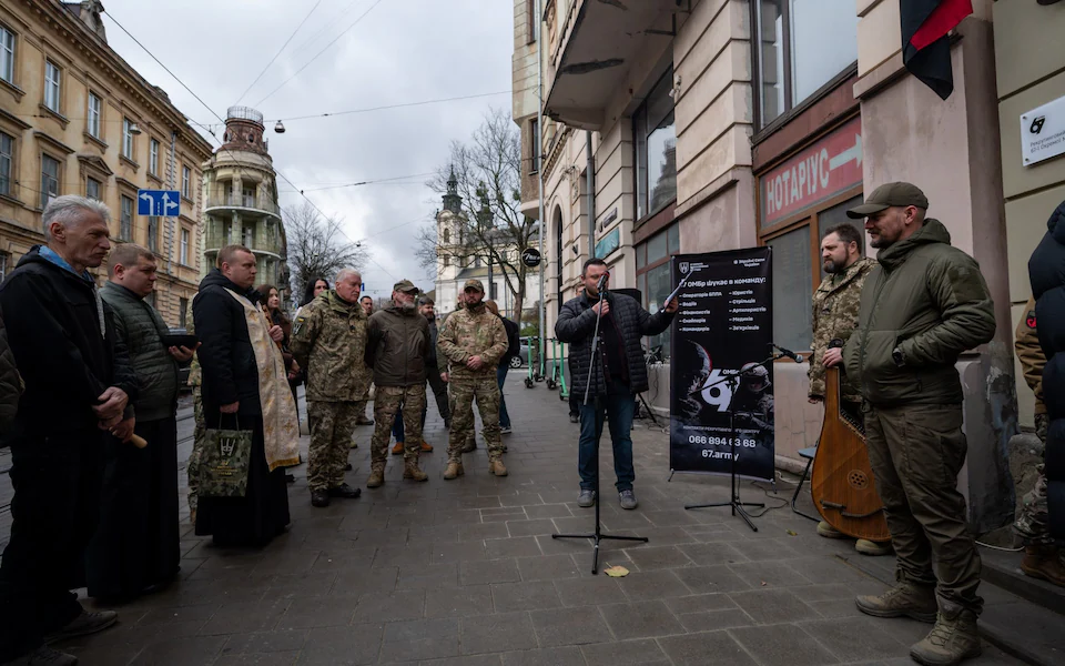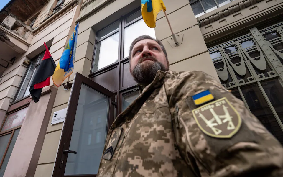 Вербовочний пункт у Львові, Україна, з чинним солдатом за межами Фото: Станіслав Іванов/Getty