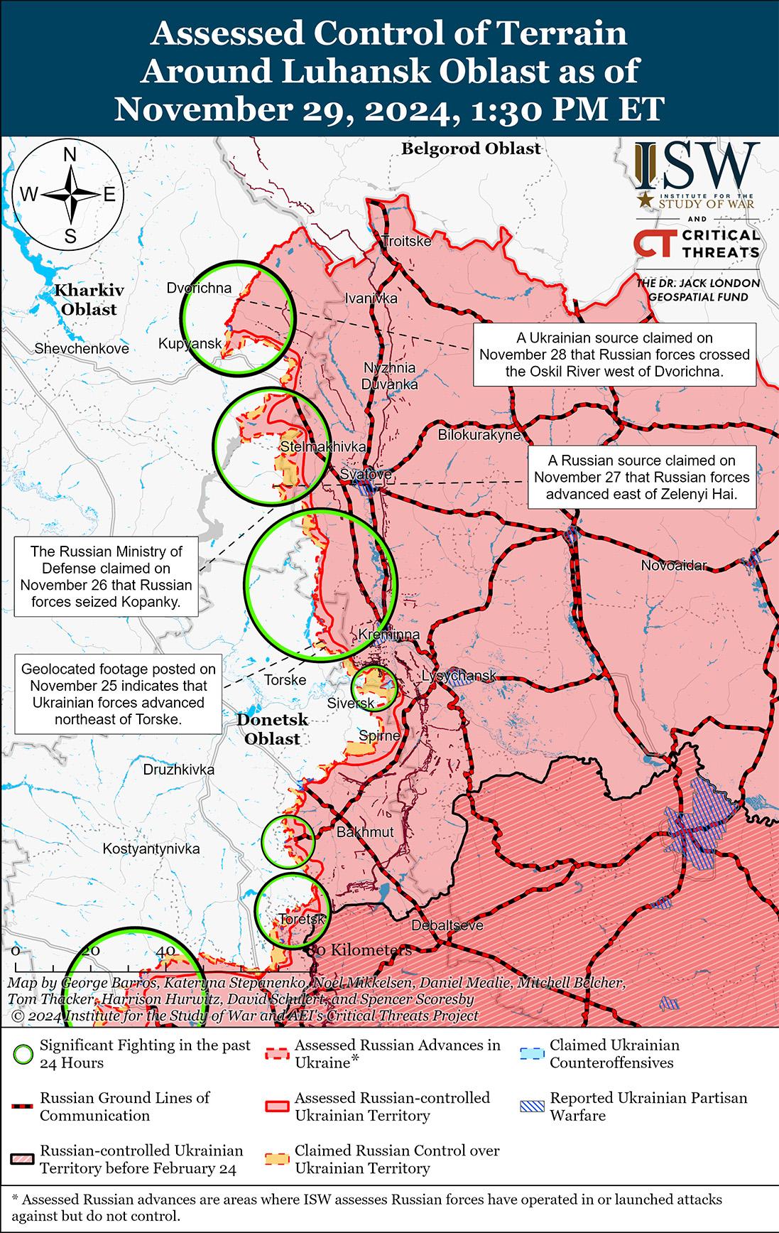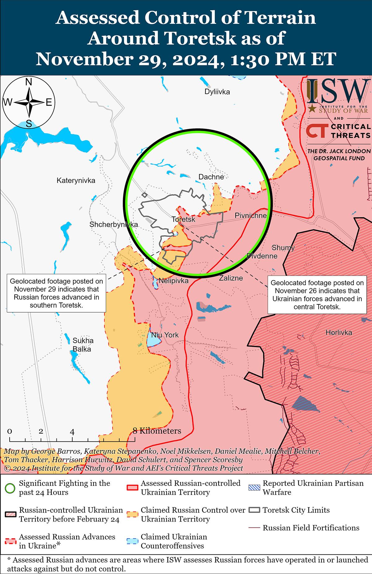 В последнее время российские войска продвинулись в южной части Торецка на фоне продолжающихся наступательных действий на Торецком направлении 27, 28 и 29 ноября. Геолоцированные кадры, опубликованные 29 ноября, указывают на то, что российские войска недавно продвинулись на север по улице Хинки в южной части Торецка. [71] 28 и 29 ноября российские военные блогеры утверждали, что за последнее время российские войска продвинулись на 250 метров вглубь в южной части Нелиповки (к югу от Торецка), продвинулись на 1,2 километра в ширину и 650 метров вглубь в лесистой местности к югу от Торецка и продвинулись на 300 метров в западной части микрорайона Забалка на юге Торецка. [72] 28 ноября пресс-секретарь Луганской группировки войск майор Анастасия Бобовникова сообщила, что ситуация в Торецке остается очень сложной из-за российских авиационных и артиллерийских ударов и интенсивных ближних боёв в городских условиях. [73] 27 ноября Бобовникова сообщила, что из-за плохих погодных условий российские войска наносят меньше авиаударов по украинским позициям в Торецке, но продолжают использовать беспилотники и проводить наземные атаки с использованием плохо обученных и оснащенных контрактников. [74] 28 и 29 ноября Генштаб Украины сообщил, что российские войска продолжили наземные атаки под Торецком и к северо-востоку от Торецка в районе Дилиевки и Дружбы. [75]