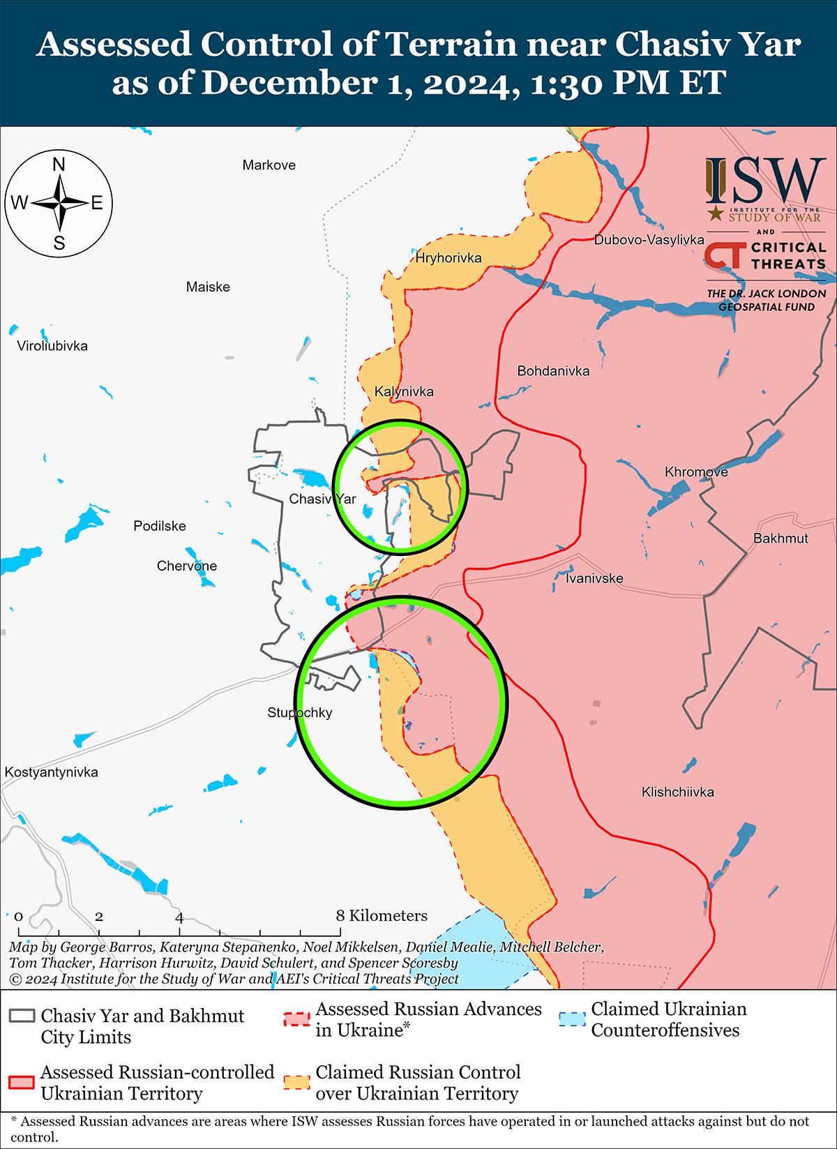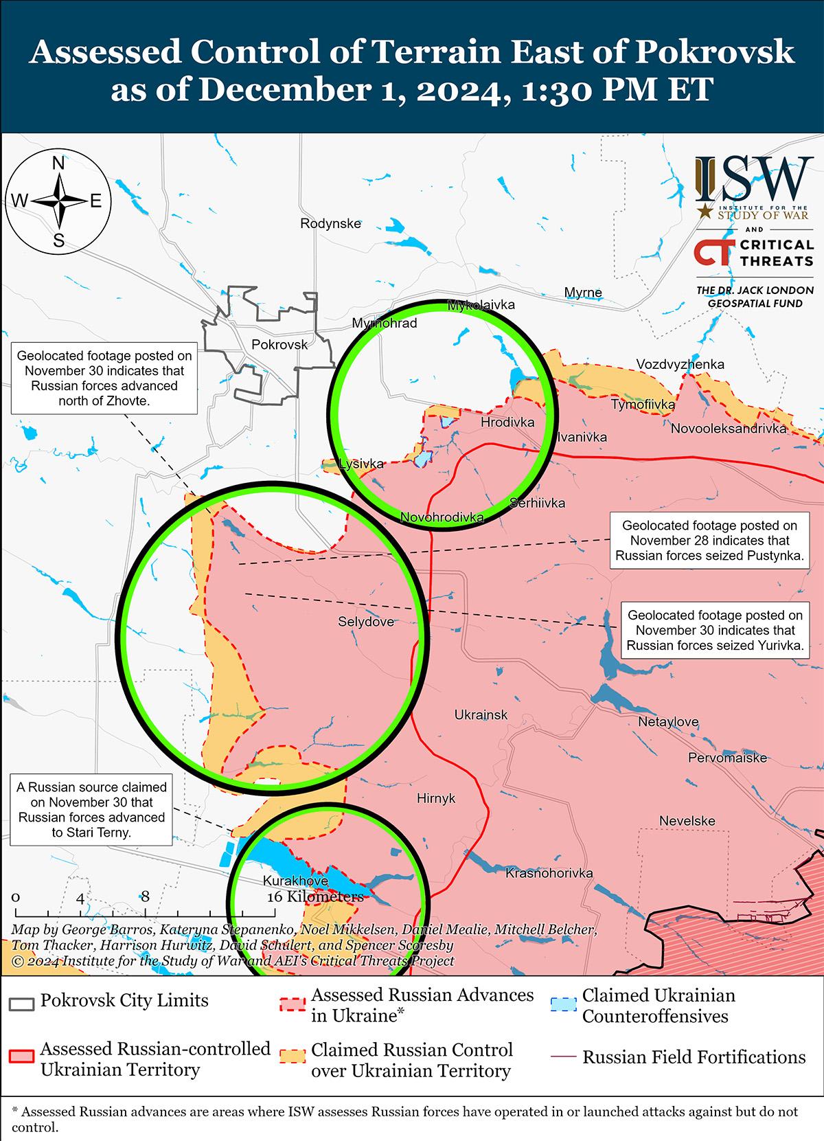 В последнее время российские войска незначительно продвинулись на Покровском направлении на фоне продолжающихся наступательных действий в этом районе 1 декабря. Геолоцированные кадры, опубликованные 30 ноября, указывают на то, что российские войска в последнее время незначительно продвинулись к северу от Желтого (к югу от Покровска). [41] Министерство обороны РФ и другие российские источники утверждают, что российские войска, в том числе подразделения отряда «Черные гусары» 15-й мотострелковой бригады (2-я ОА, Центральный военный округ), захватили Петровку (к югу от Покровска) по состоянию на 1 декабря, но, по оценкам ISW, российские войска, вероятно, захватили населенный пункт по состоянию на 27 ноября. [42] Российские военные блогеры утверждали, что российские войска захватили Желтое и продвинулись в направлении Новопустынки и Новотроицкого (оба к юго-западу от Покровска), однако в ISW не обнаружили визуальных доказательств этих утверждений. [43] Украинский Генштаб сообщил, что бои продолжаются к востоку от Покровска в районе Миролюбовки, Мирнограда и Проминя; юго-восточнее Покровска в районе Лысовки и Крутого Яра; и южнее Покровска в районе Нового Труда, Пустынки, Даченского, Желтого и Пушкино 30 ноября и 1 декабря. [44] Командир украинского артиллерийского разведывательного батальона, действовавшего на Покровском направлении, заявил, что враг продолжает попытки наступления в районе Желтого и Лысовки, а также вдоль близлежащих железнодорожных путей в направлении Покровска. [45] Командир заявил, что враг ведет пехотные атаки группами по 20–30 человек и снова атакует тем же количеством личного состава через 30–40 минут после отражения первого штурма. Командир заявил, что российские войска иногда используют небольшие пехотные группы для проведения штурмов и что российские войска наносят артиллерийские и авиационные удары по украинским наземным линиям коммуникаций (НЛК) и передовым позициям. Командир также отметил, что низкая облачность осложняет использование беспилотников. Представитель украинской бригады, действующей на Покровском направлении, заявил, что их бригада ведет оборону против подразделений четырех мотострелковых бригад РФ, в том числе подразделений 74-й мотострелковой бригады (41-я ОА, ЦВО). [46]