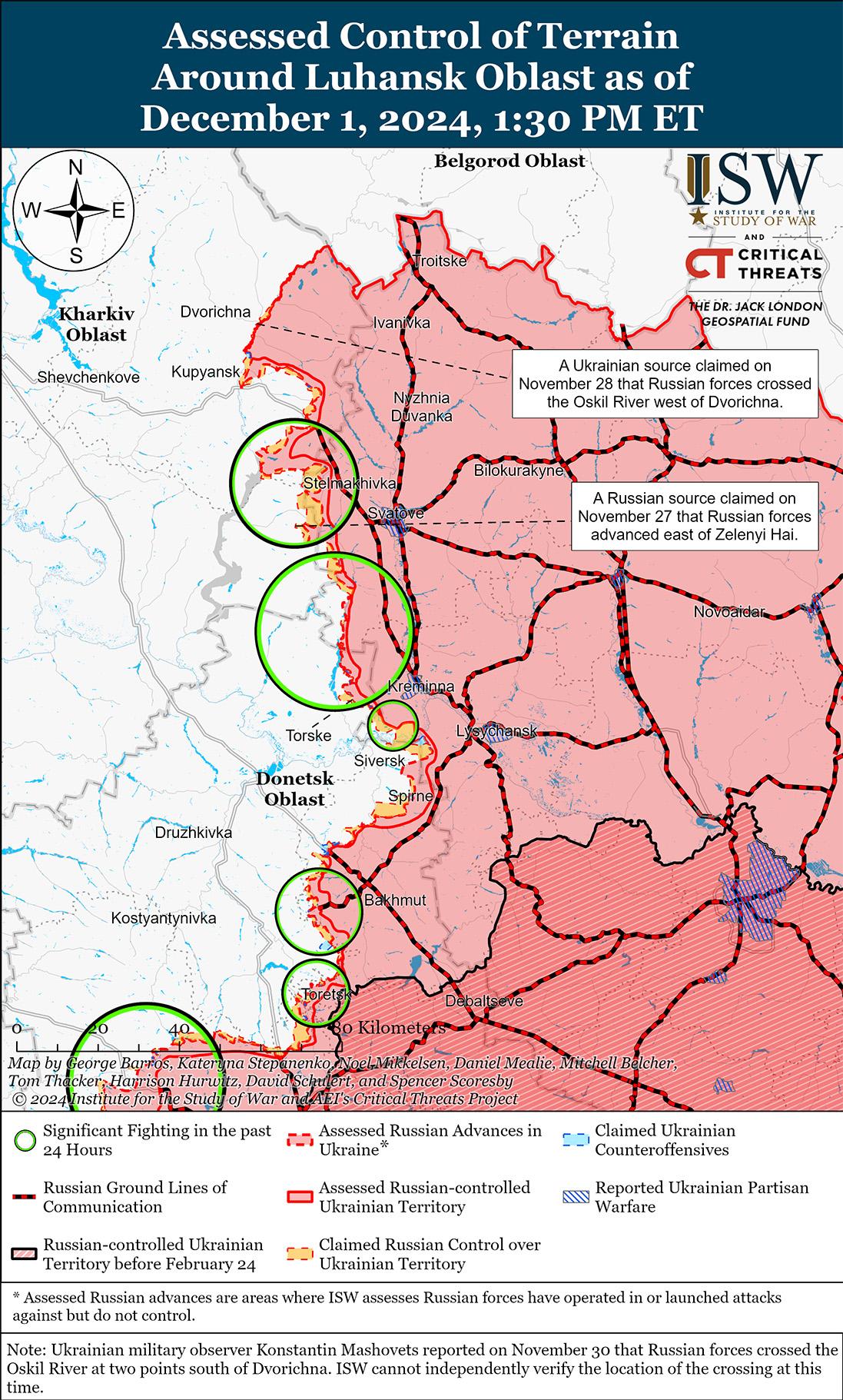 1 декабря враг продолжил наступательные действия по линии Купянск – Сватово – Кременная, однако подтвержденных изменений линии фронта не было. Российский военный блогер заявил, что российские войска продвинулись в районе Двуречной (к северо-востоку от Купянска), но ISW не обнаружил подтверждения этому заявлению. [28] Украинский военный обозреватель Константин Машовец заявил 1 декабря, что российские войска форсировали реку Оскол к югу от Двуречной и создали второй плацдарм численностью до роты в районе Масютовка – Западное. [29] Российские военные блогеры делали аналогичные заявления о российском плацдарме в этом районе, причем один военный блогер утверждал, что украинские войска безуспешно контратаковали. [30] Российские войска вели наступательные действия к северо-востоку от Купянска в районе Двуречной и Новомлынска; к юго-востоку от Купянска в районах населенных пунктов Лозовая, Кругловка, Песчаное, Колесниковка и Загрызово; к западу от Сватово в районе Зеленого Гая; юго-западнее Сватово в районе Дружелюбовки и Новоегоровки; к северо-западу от Кременной в районе Грековки; к западу от Кременной у Тернов, Торского и Заречного; и южнее Кременной под Григорьевкой 30 ноября и 1 декабря. [31] Машовец отметил, что река Оскол еще не замерзла и что у российских войск в настоящее время нет достаточных сил и средств для расширения масштабов наступательных действий по захвату Купянска. [32] Машовец сообщил, что в районе Песчаное – Колесниковка – Кругляковка действуют соединения российской 1-й гвардейской танковой армии (ГТА) (МВО), включая 2-ю мотострелковую дивизию и части 4-й танковой дивизии. [33] Сообщается, что подразделения российской 16-й бригады спецназа (Главное управление Генерального штаба России [ГРУ]) действуют в районе Заречного и Новолюбовки. [34]