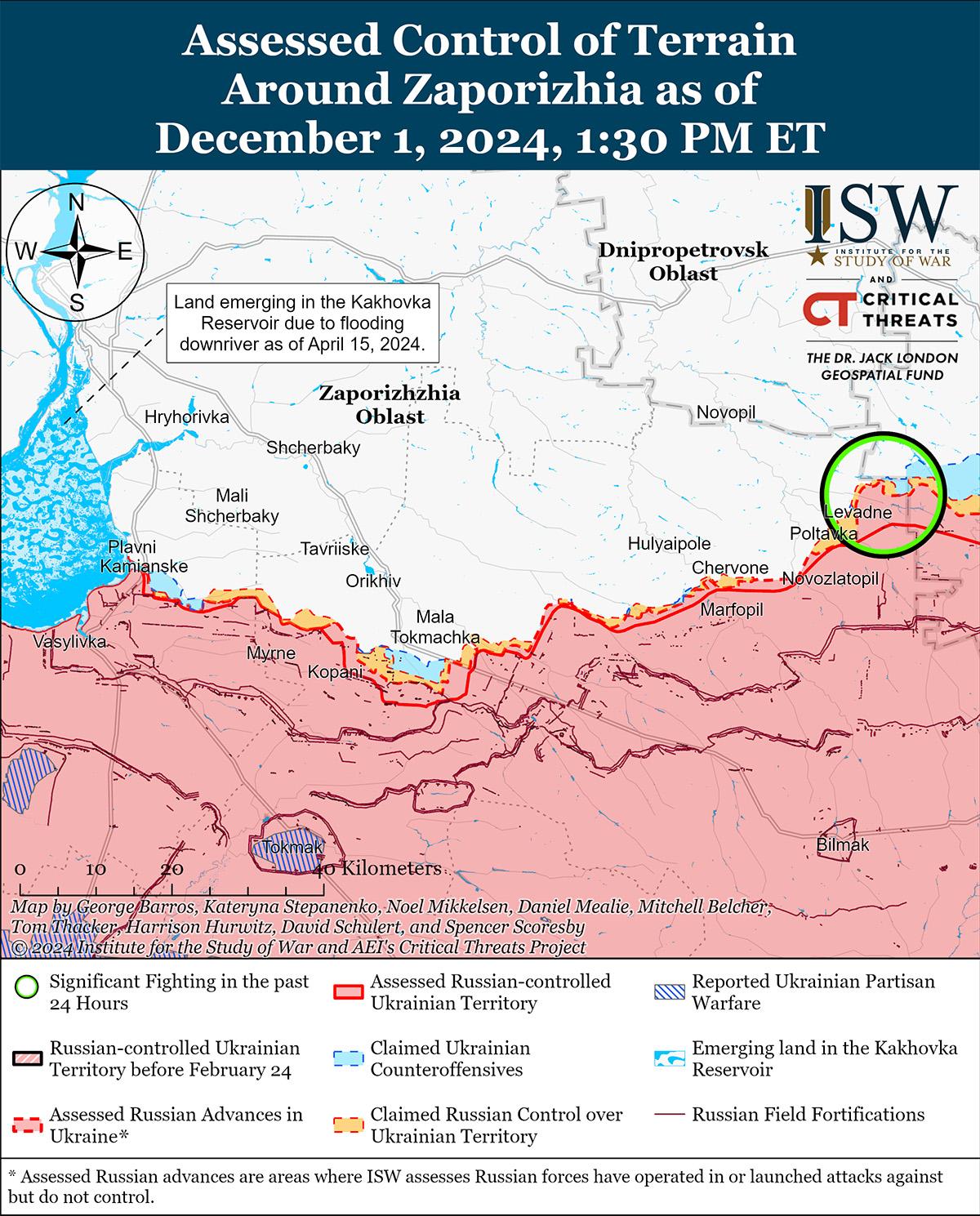 Российские войска в последнее время незначительно продвинулись на Запорожье на востоке Запорожской области. На геолоцированных кадрах, опубликованных 1 декабря, видно, что российские войска в последнее время незначительно продвинулись на севере Дорожнянки (к югу от Гуляйполя). [61] Российские и украинские источники не сообщали о боях на восточной границе Запорожской области 1 декабря.