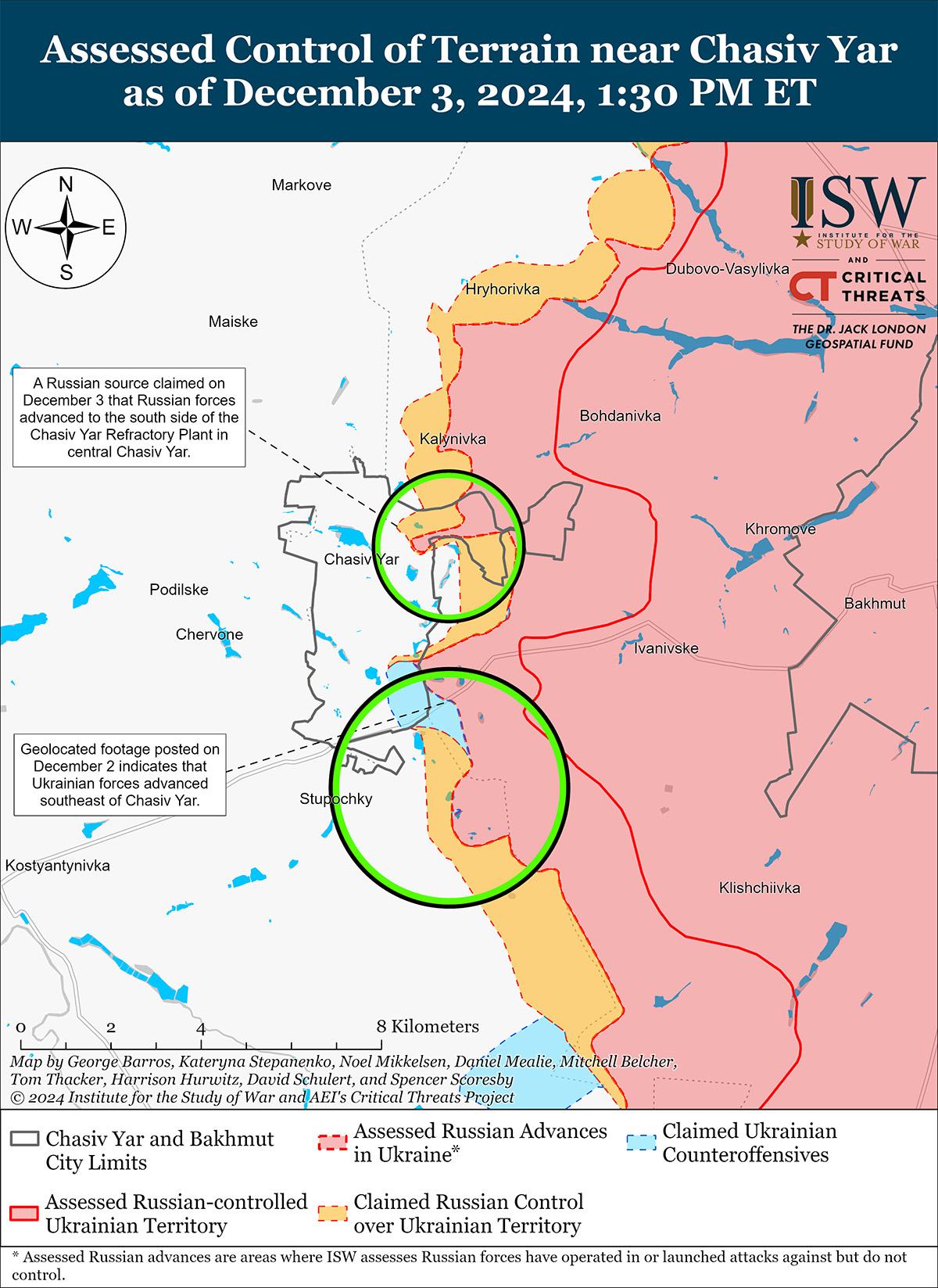 3 декабря враг продолжил наступательные действия на направлении Часов Яр, но подтвержденных успехов не имел. 3 декабря российский военный блогер заявил, что российские войска продвинулись на южную сторону огнеупорного завода «Часов Яр» в центре Часова Яра, но ISW не обнаружил подтверждения этого заявления. [29] 2 и 3 декабря враг продолжал атаковать в районе Часова Яра, в центре Часова Яра и к северу от Часова Яра в районе Григорьевки. [30] Представитель украинской бригады, действующей на направлении Часов Яр, 3 декабря заявил, что темп российских наступлений и количество российских авиаударов в этом районе в последнее время снизились, а также что российские войска испытывают трудности с логистикой из-за отсутствия естественной маскировки из листвы. [31] 3 декабря российский военный блогер заявил, что неблагоприятные зимние погодные условия негативно повлияли на способность российских и украинских сил использовать беспилотники в направлении Часова Яра. [32] Военный блогер также отметил, что российские войска используют погодные условия для проведения наземных атак на украинские позиции в Часовом Яру, вероятно, из-за снижения активности украинских беспилотников. Другой российский военный блогер заявил 2 декабря, что российские войска нанесли удар ракетой «Искандер» по украинскому бункеру к югу от Часов Яра, но ISW не обнаружил подтверждений или других заявлений об этом российском ракетном ударе. [33] Сообщается, что в районе Часова Яра действуют подразделения 98-й воздушно-десантной дивизии (ВДВ), операторы беспилотников российского отряда спецназа «Охотник» (51-я общевойсковая армия, бывший 1-й армейский корпус Донецкой Народной Республики [АК «ДНР»]) и российская 5-я казачья разведывательная бригада «Терек» (предположительно, входящая в состав добровольческого Казачьего штурмового корпуса). [34]